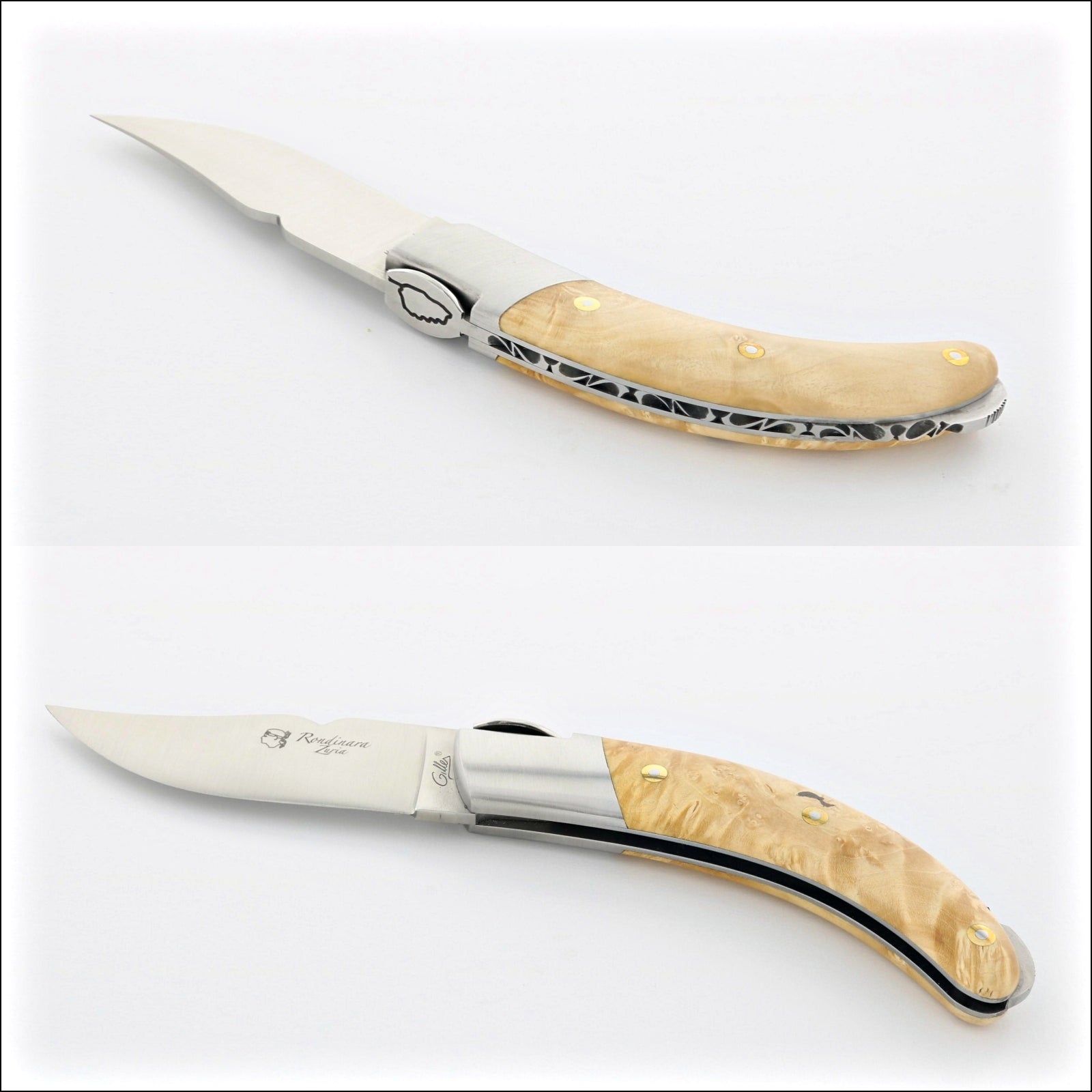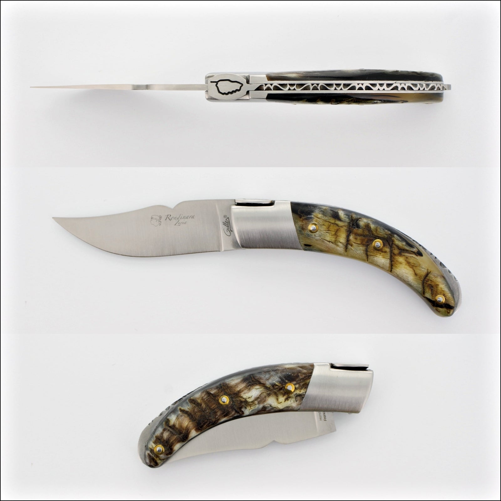 This knife was named after one of Corsica's most secluded white sand beaches. Rondinara is located a few kilometers from Bonifacio in southeast Corsica. This Corsican knife was created in collaboration with the Zuria family of Bonifacio Corsica.Blade Size: 8.6 cm (3.38") | Handle Size: 12.2 cm (4.6") including back-lock release | Open Size: 20.8 cm (8.18")