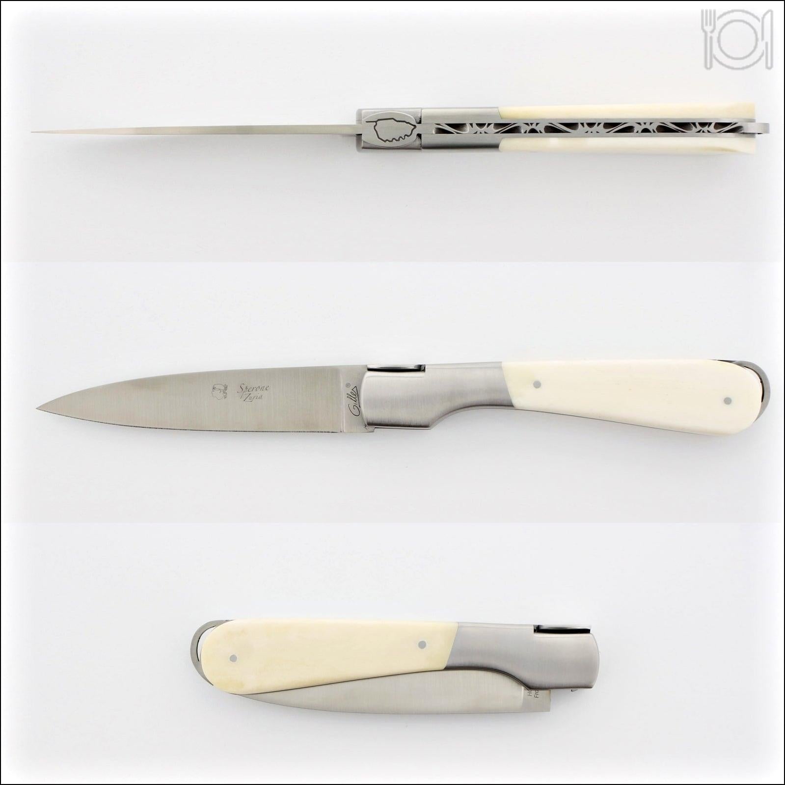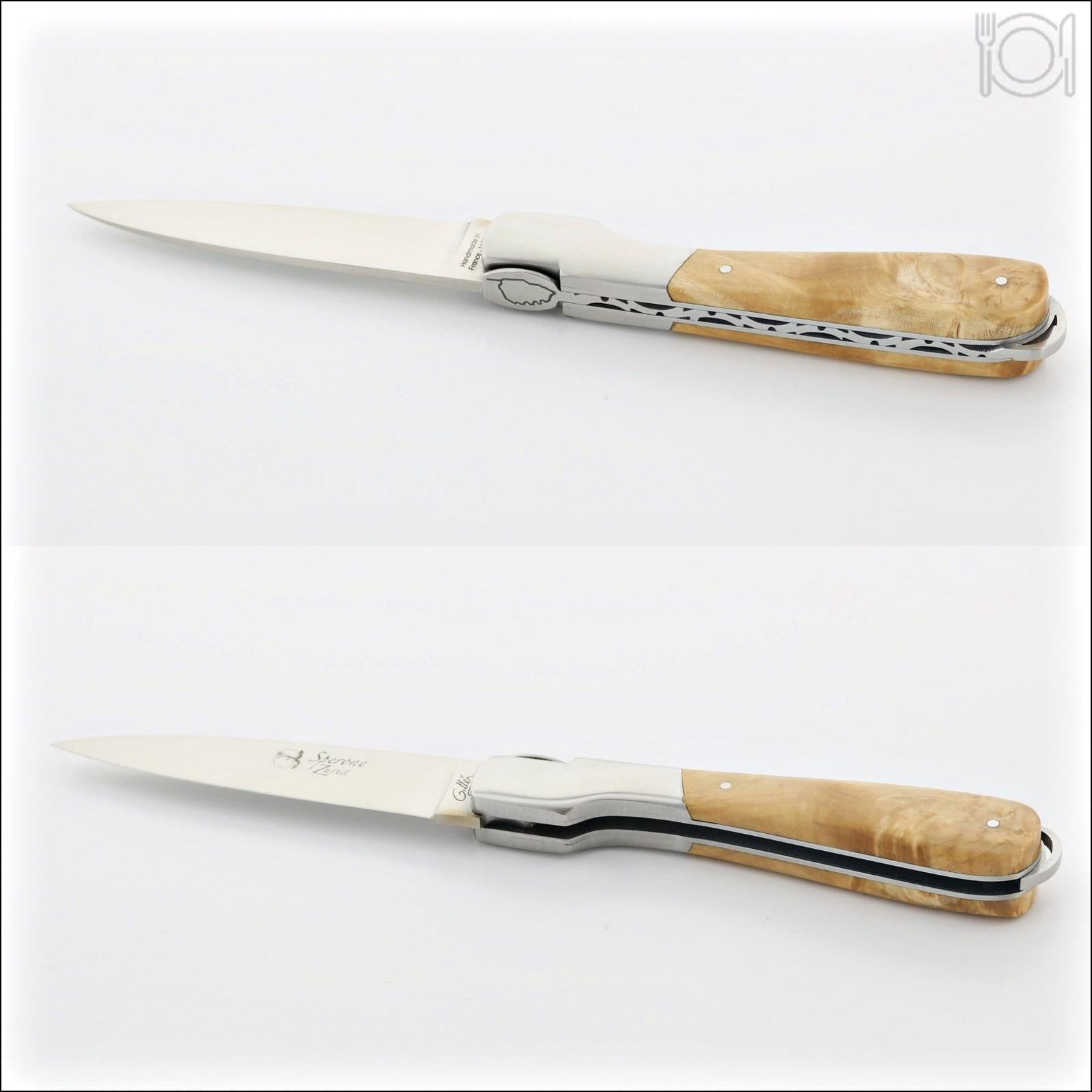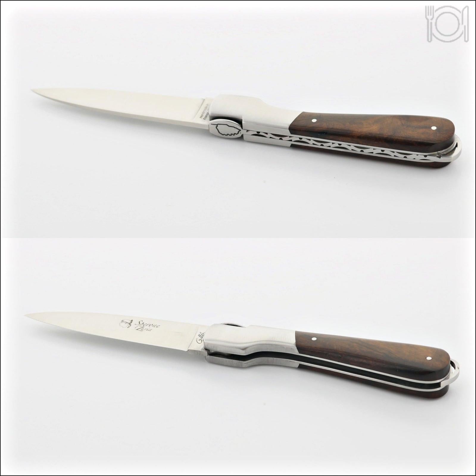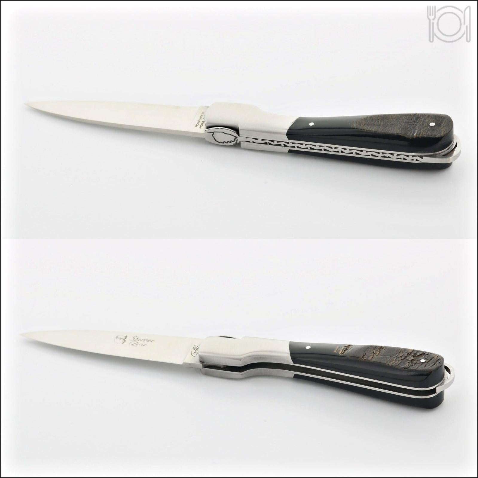 Introducing another exquisite addition to Fontenille Pataud's Corsican series: a highly ergonomic folding knife. Unlike the Rondanira knife, the Sperone 12 cm model showcases a modified single-edge spear point blade. However, please note that it is not meant for throwing purposes. With its considerable length, this knife serves as an excellent choice for daily use at the dining table. It's important to note that this is not a split-joint knife, and the blade cannot be folded unless the lock-back mechanism is pressed firmly.