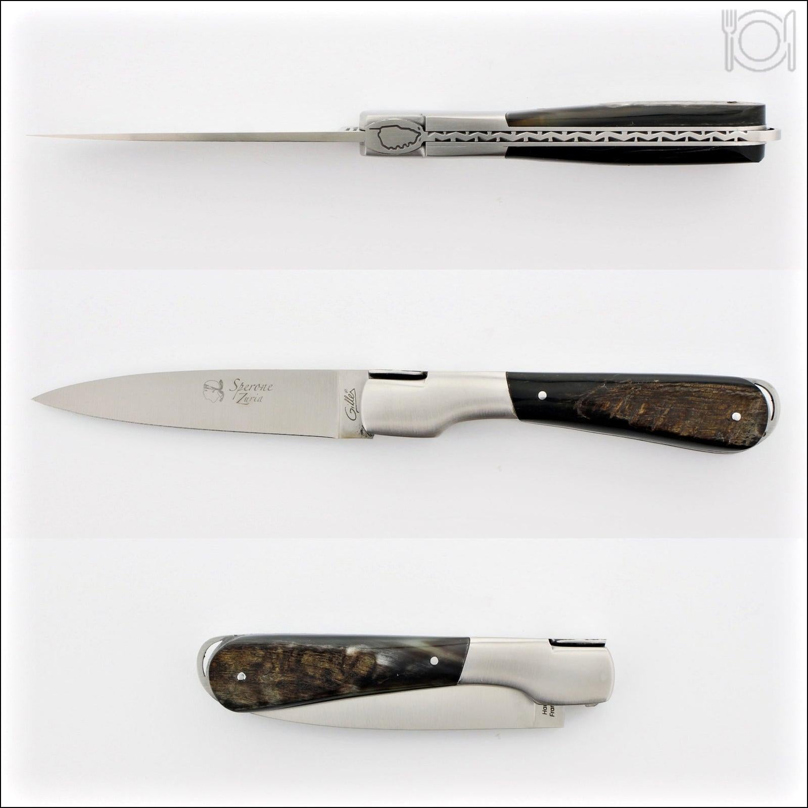The Corsican "Moor's head" stamp adorns the blade, reflecting the island's heritage and Napoleon Bonaparte's birthplace. This Corsican knife was created in collaboration with the Zuria family of Bonifacio Corsica, as with all other knives offered by Fontenille Pataud.
