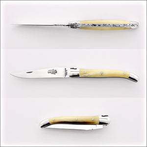 There are many reasons a Laguiole knife can retail for much more than another model of similar size and material. The finish of the metal, the construction of the spring and bee, and the chiseling and filing of the spring & bee all contribute to the added cost. Most mass-market Laguiole knives have a soldered bee and rarely a hand-chiseled spring top and bee. This collector's knife also features the iconic Shepherd's cross and a blade stop to prevent the blade from contacting the bottom of the spring.