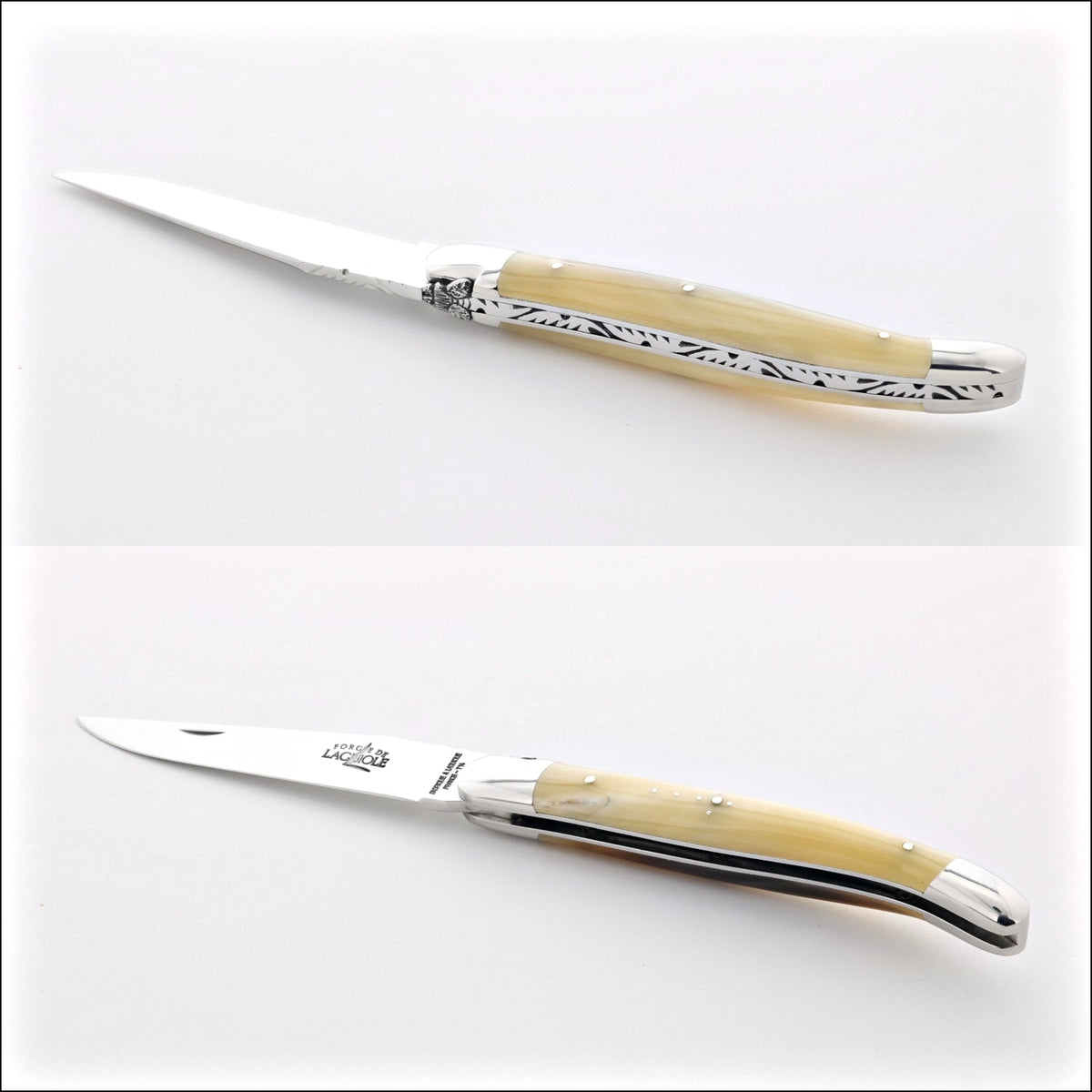 The file work on the springs (top of handle) are individually hand filled by a French artisan, therefore all are different. Additionally, two handles made from the same material can have very different patterns.