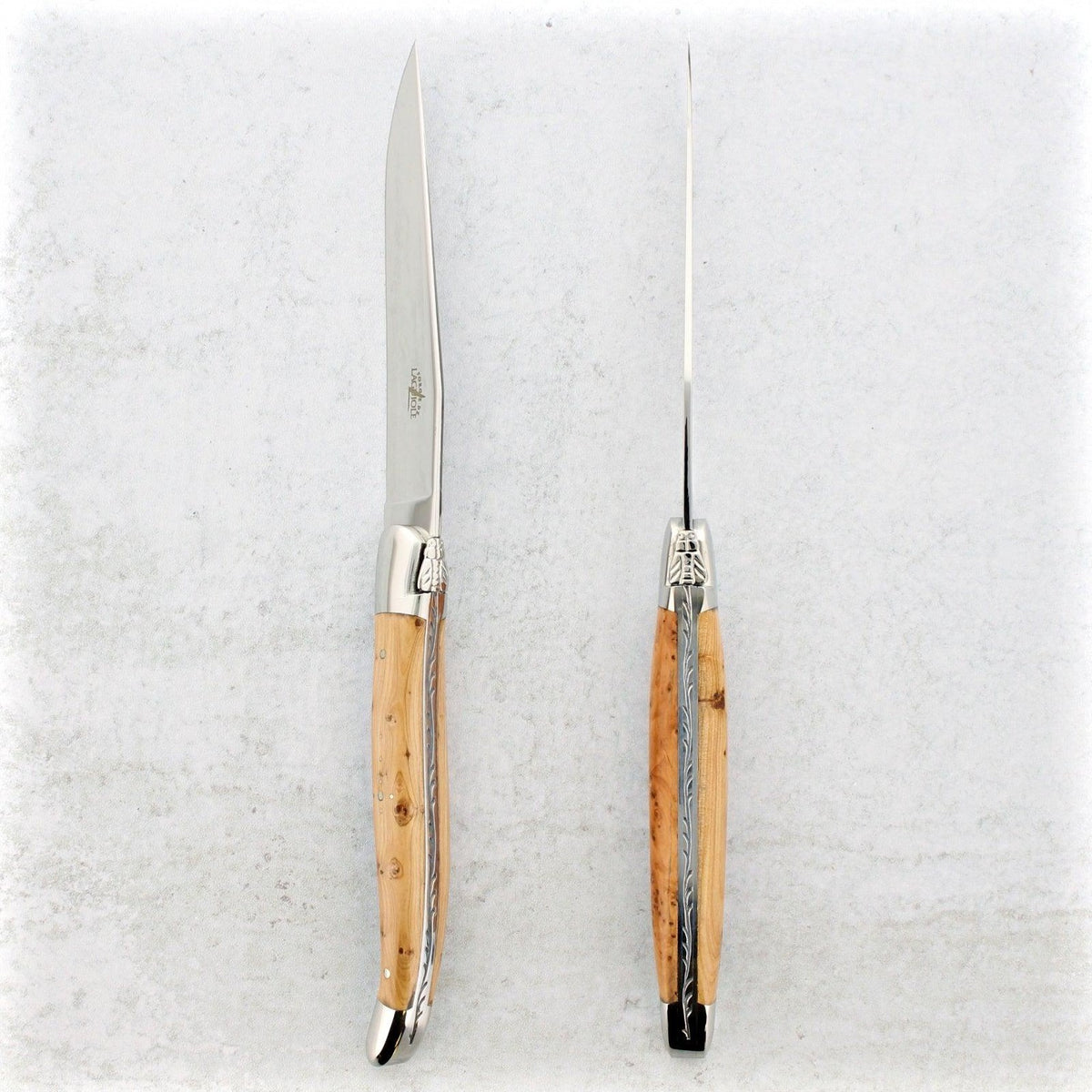 The Original Forge de Laguiole steak knives are used by the greatest Chefs around the world, including dozens of Michelin-Star restaurants. High-end steak knives are never serrated; one should not feel the need to "saw" a steak.