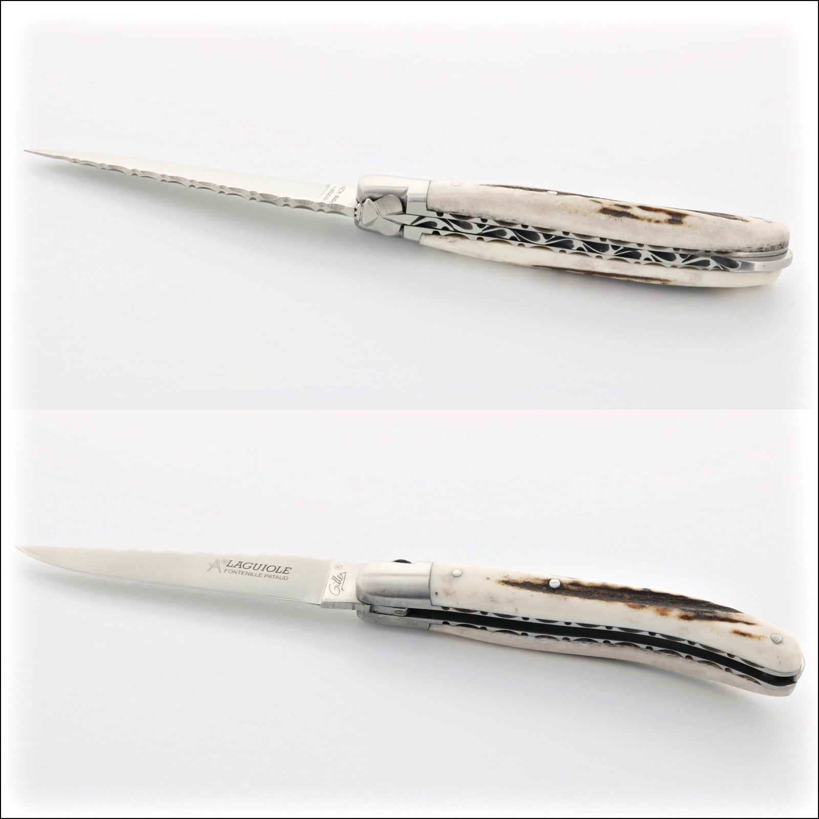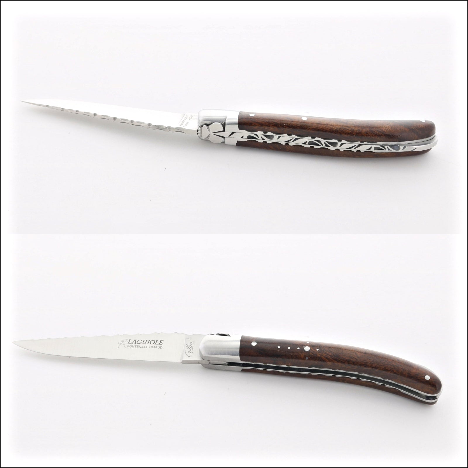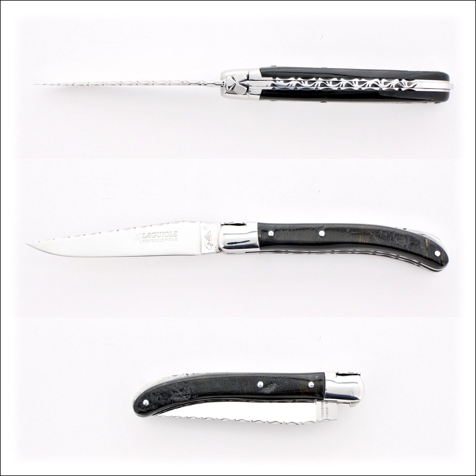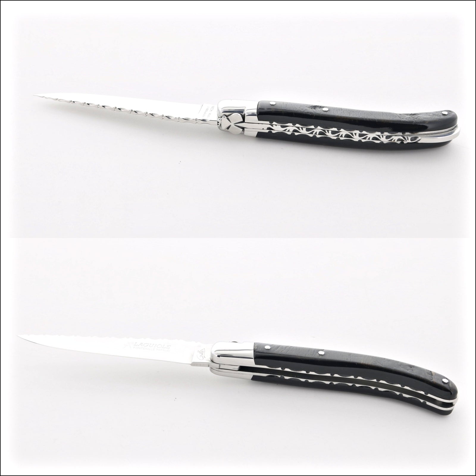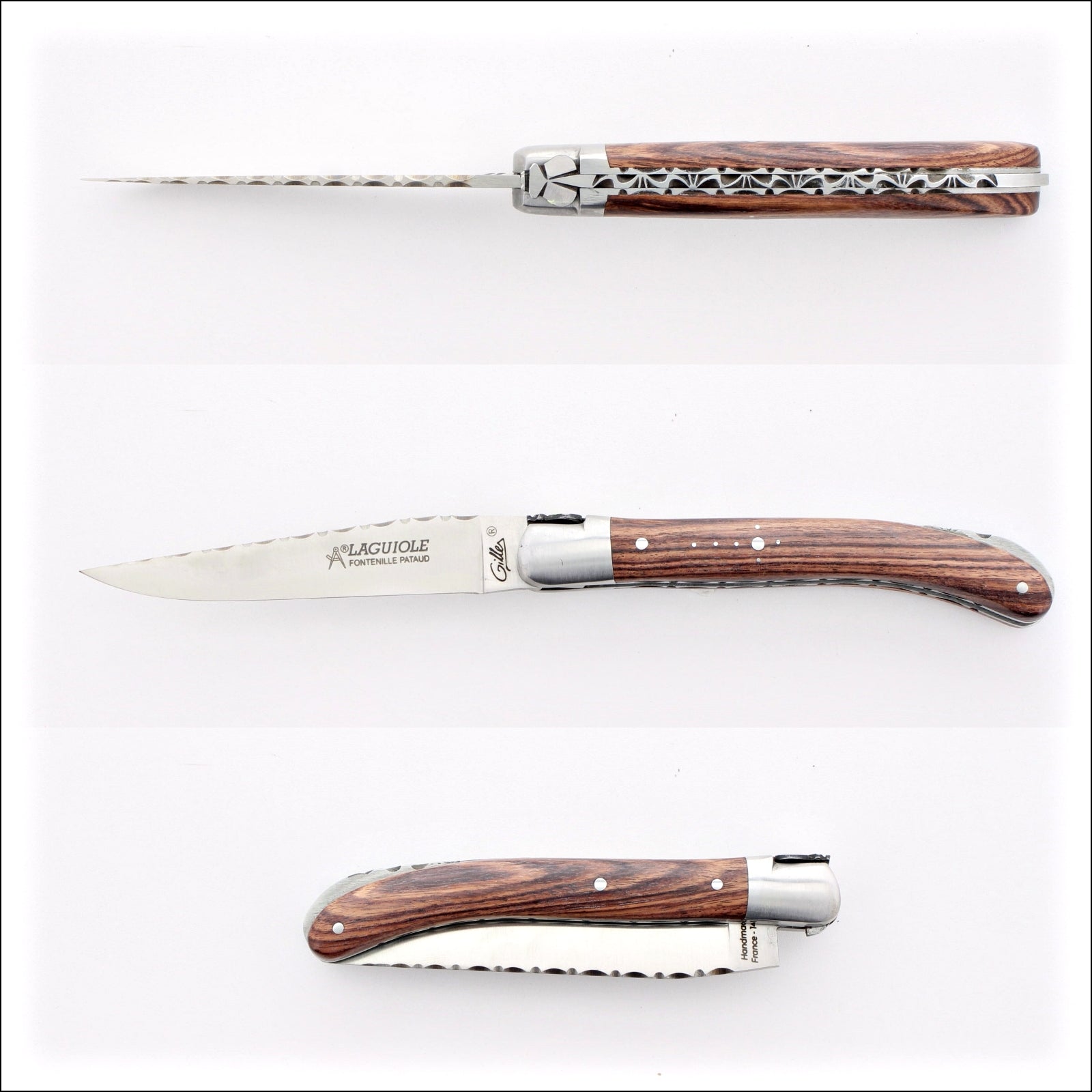 Crafted for beauty and precision, this sleek pocket knife incorporates a secure lock-back mechanism and Teflon washers for smooth blade operation. The one-piece forged spring and "Bee" add elegance to its form. With a 10.5 cm (4.10") handle, this Laguiole folding knife packs a punch of sophistication in its compact design. Perfect for tackling everyday tasks, all with a touch of style. The Guilloche series features a fully chiseled blade top as well as chiseled liners top and bottom.