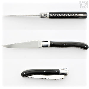 A 12 cm Laguiole folding knife can be used as a steak knife; its open length is 8. 3/4" vs. ~9" for a standard steak knife. Why use such a knife at the dinner table or your favorite steak house? Check out our article (new tab) for the surprising answer.