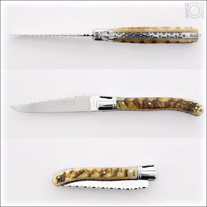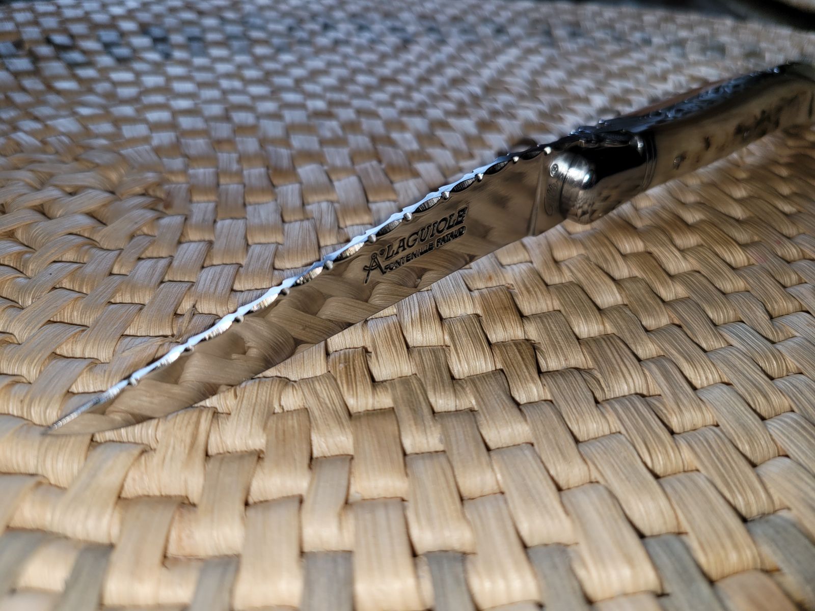 This time a Rams horn handled Laguiole nature...the locking mechanism is so smooth...unbelievable. The blade is dead center, no play what so ever...flawless fit and almost flawless finish on the blade ( cutting and buffing ) 9 1/2 out of 10 ) the Rams horn is beautiful...no cracks. Blade is straight and decent sharp. I pulled it over a firm buffing wheel and a leather strobe...it dry shaved hair on my arm easily!!!