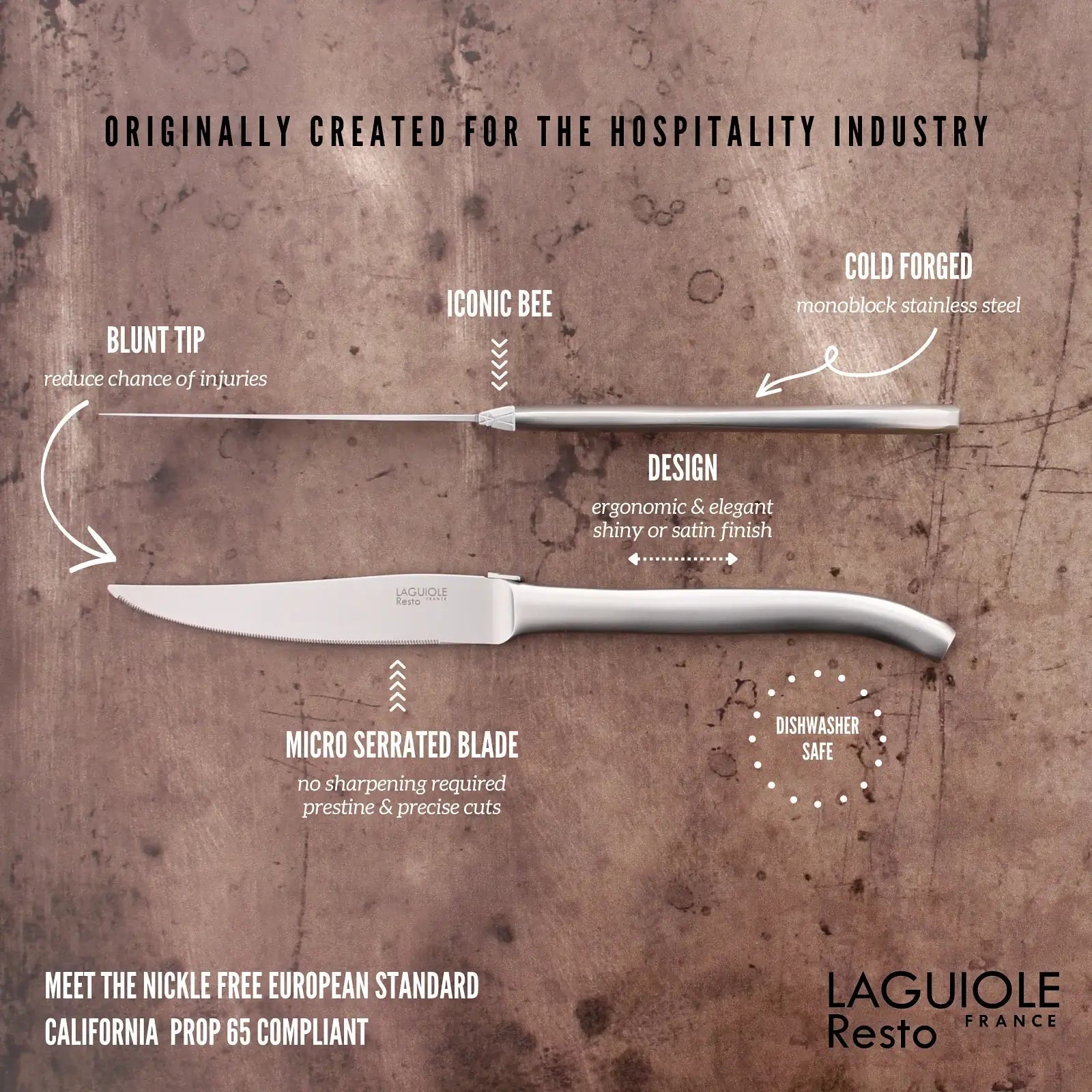Meticulously crafted from a single rod of high-quality stainless steel, these exquisite Laguiole steak knives are expertly engineered to withstand the demanding conditions of the food service industry while effortlessly maintaining their sophisticated elegance and unparalleled sharpness.