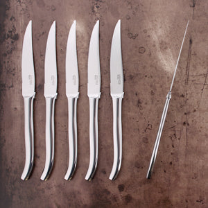 These Laguiole steak knives exhibit a striking mirror-polished stainless steel finish that radiates brilliance. Moreover, they are also available in a sophisticated satin finish. You can discover more about metal finishes here if you're undecided on which one to pick.