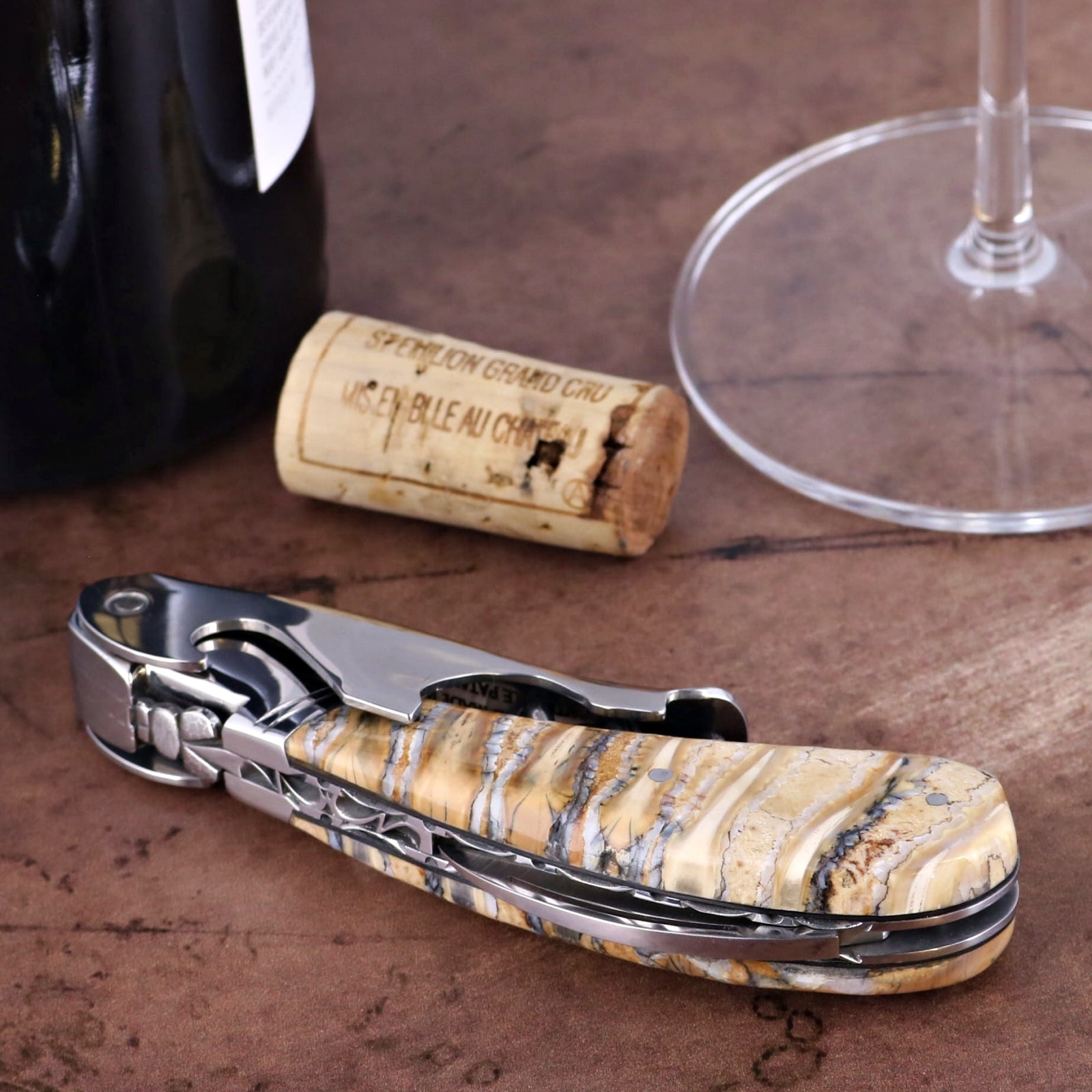These Laguiole Magnum's handles are made of 10,000+ years old fossilized mammoth molar teeth harvested in Siberia. The molar is stabilized for strength and dyed in various colors, some of which are pretty stunning. Note that only one color is used to create a handle; the color variance within a handle is caused by the ability of certain areas of the tooth (i.e., enamel) to absorb the single-color dye. Fossilized molar is a tough material because of its enamel layers; in many cases, diamond-cutting tools must be used to cut it.