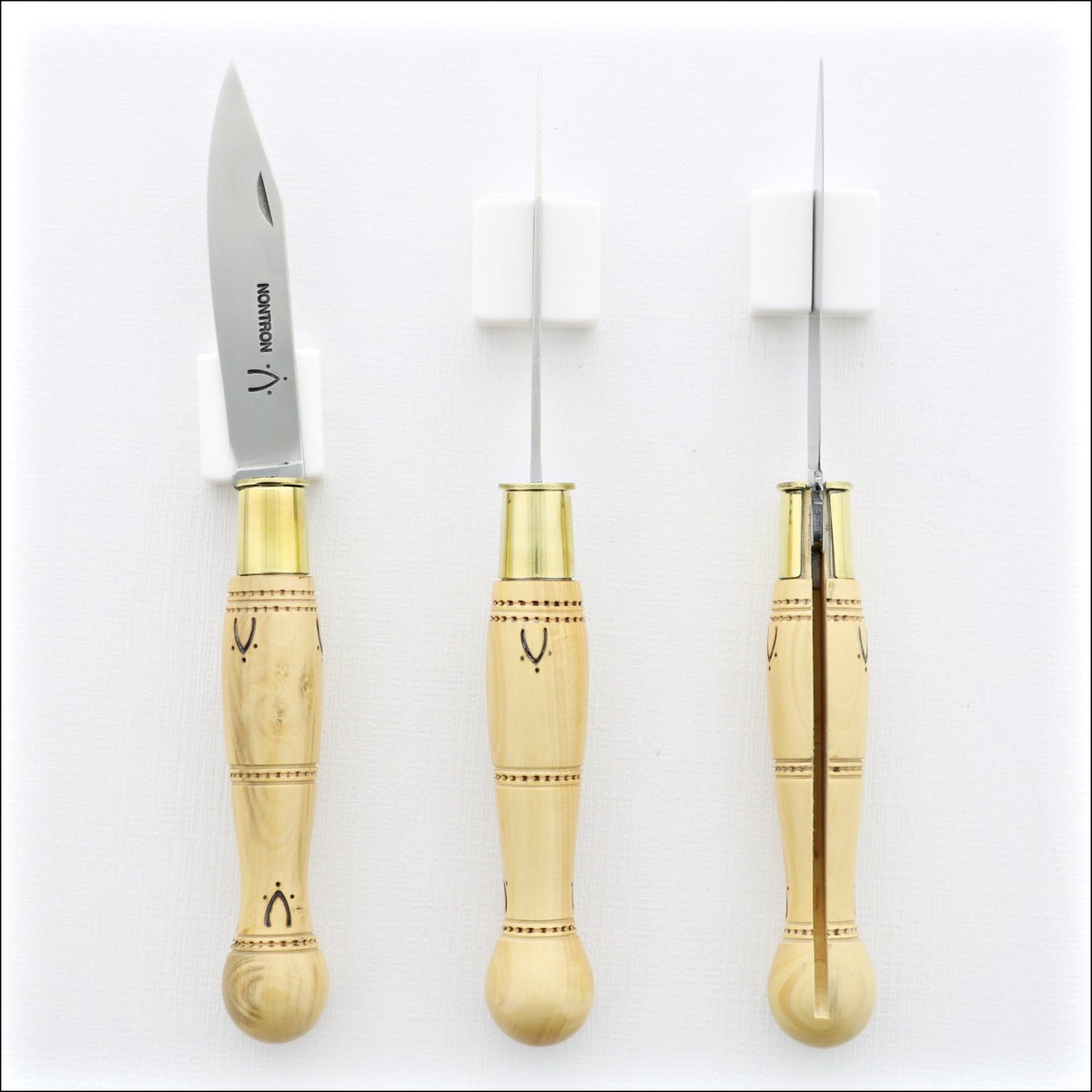 The Nontron knife shares the name of the French village of its birth located in the Dordogne department. This knife's history is filled with so many legends that it is difficult to date its exact origin; however, most experts agree that the Nontron knife is the oldest French folding knife dating back to the 13th century. Today, the cutlery that bears its name since 1928 produces handmade knives using ancestral methods. The procedures used to conceive todays' Nontron pocket knives are nearly the same since the fifteenth century.