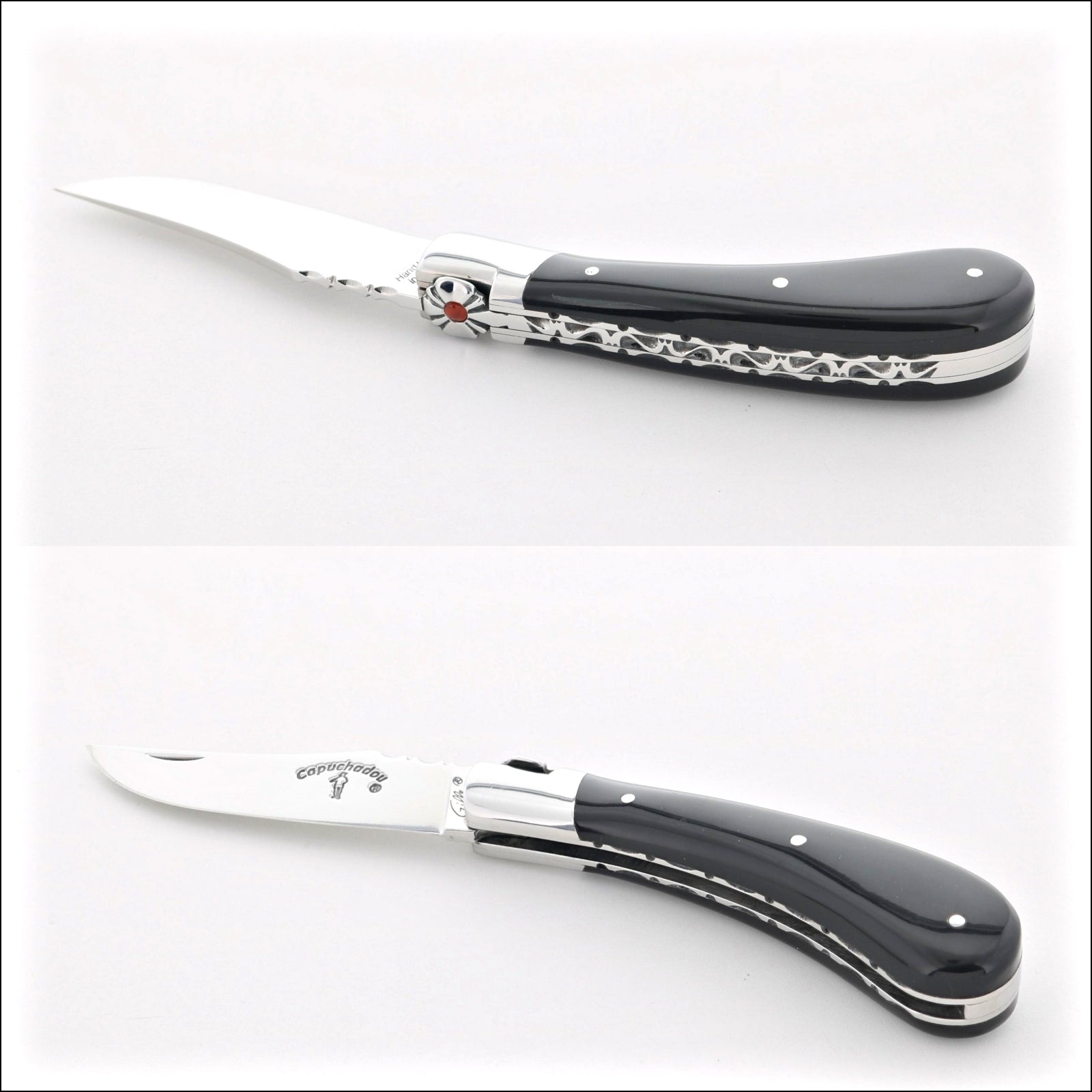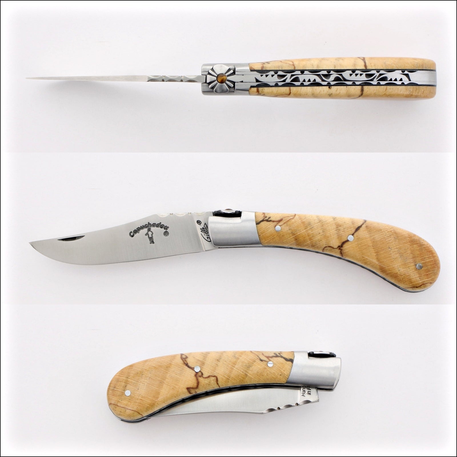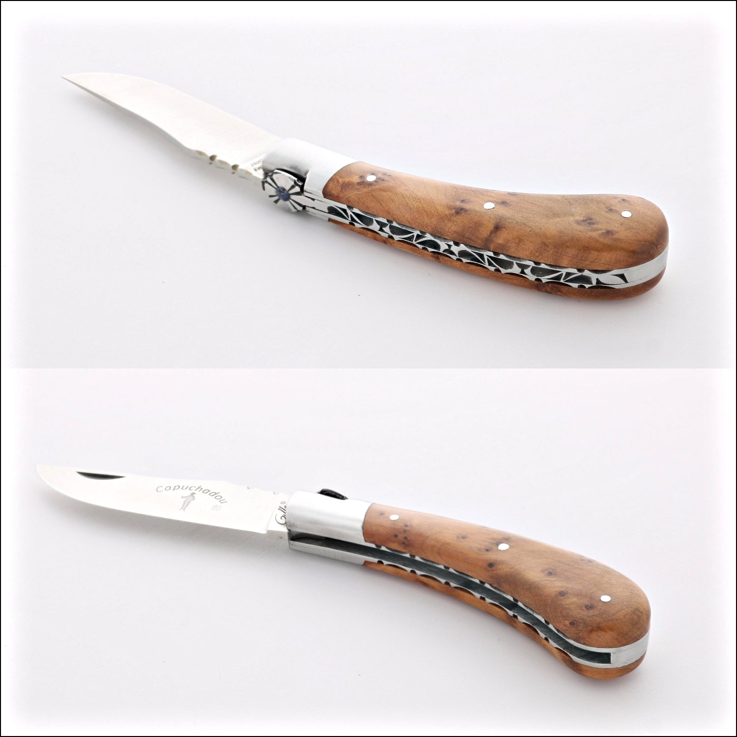 Before the development of the Laguiole knife in the 19th century, French shepherds used a knife called the "Capuchadou" (or "capujadou"). This versatile knife served many daily purposes, from preparing lunch to tending to their flock of sheep. Fontenille Pataud stands out as one of the premier manufacturers of French pocket knives. Each Capuchadou is 100% made in France and features a smooth mechanism along with a solid blade stop that protects the blade's edge when the knife is closed. The Guilloché series beautifully displays intricate chiseling techniques expertly applied to the spring, both liners (top and bottom), and the entire blade's top edge. The outcome is nothing short of a mesmerizingly crafted masterpiece.