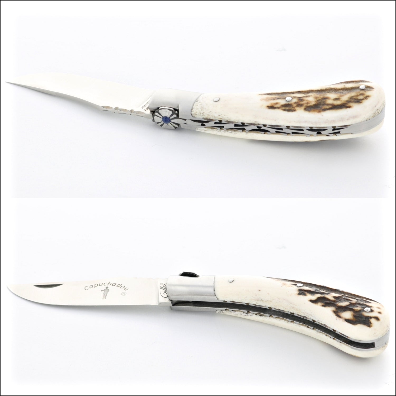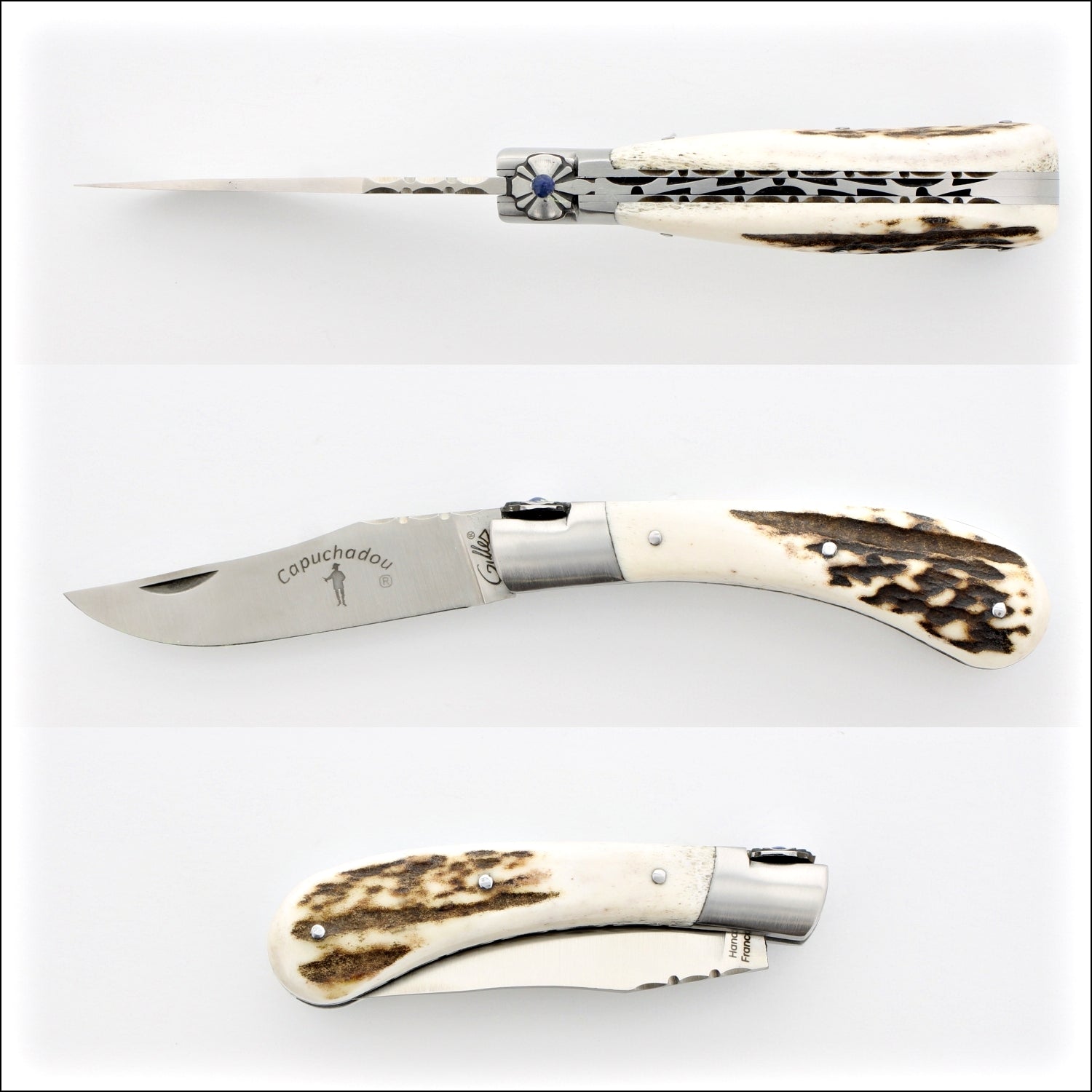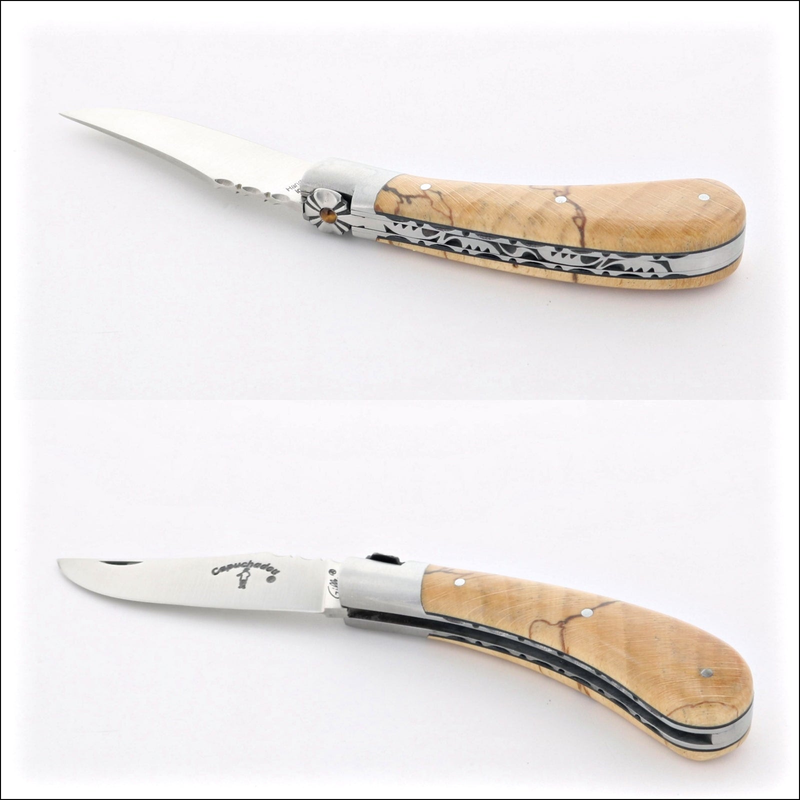 Before the development of the Laguiole knife in the 19th century, French shepherds used a knife called the "Capuchadou" (or "capujadou"). This versatile knife served many daily purposes, from preparing lunch to tending to their flock of sheep. Fontenille Pataud stands out as one of the premier manufacturers of French pocket knives. Each Capuchadou is 100% made in France and features a smooth mechanism along with a solid blade stop that protects the blade's edge when the knife is closed. The Guilloché series beautifully displays intricate chiseling techniques expertly applied to the spring, both liners (top and bottom), and the entire blade's top edge. The outcome is nothing short of a mesmerizingly crafted masterpiece.
