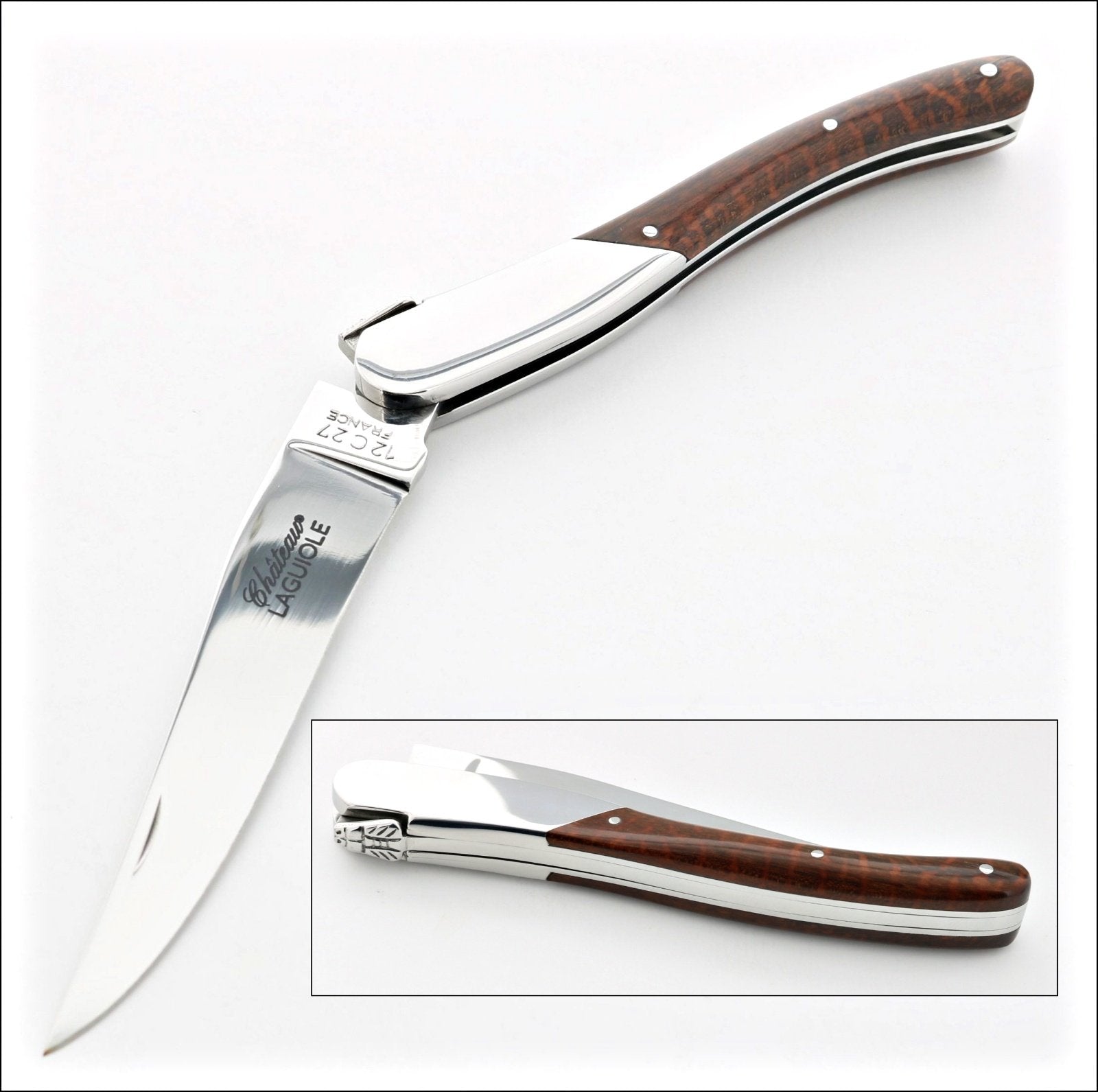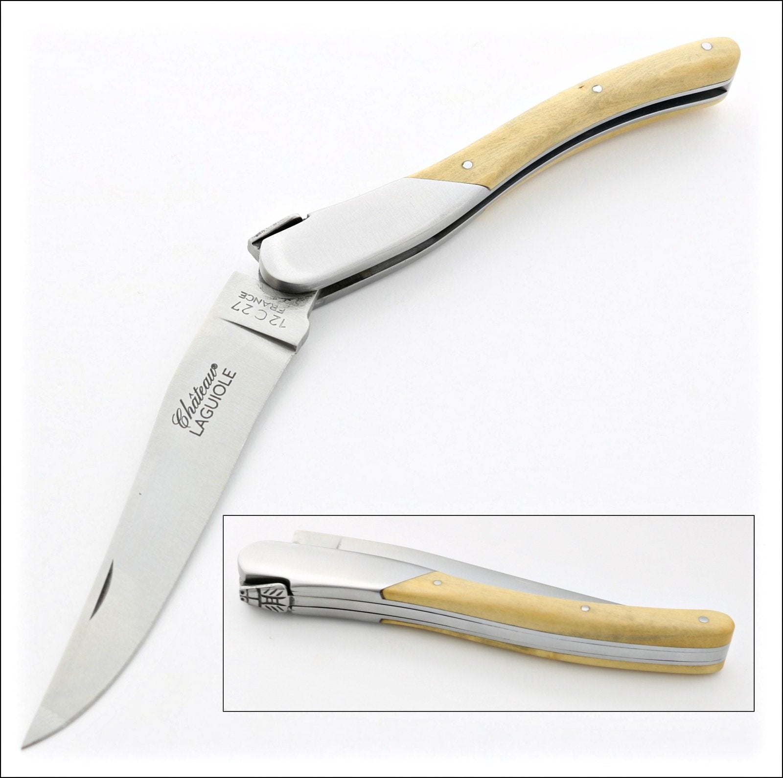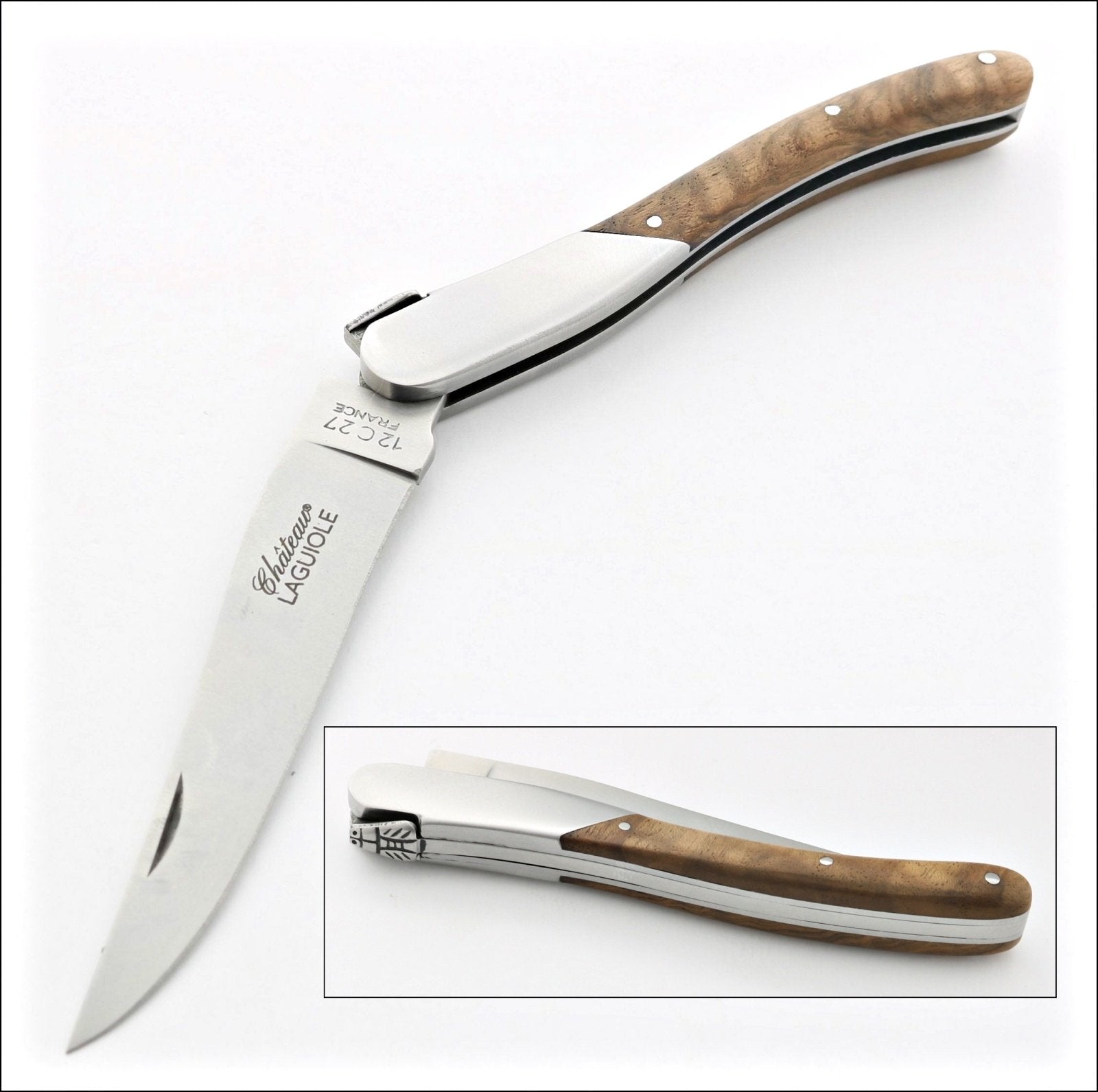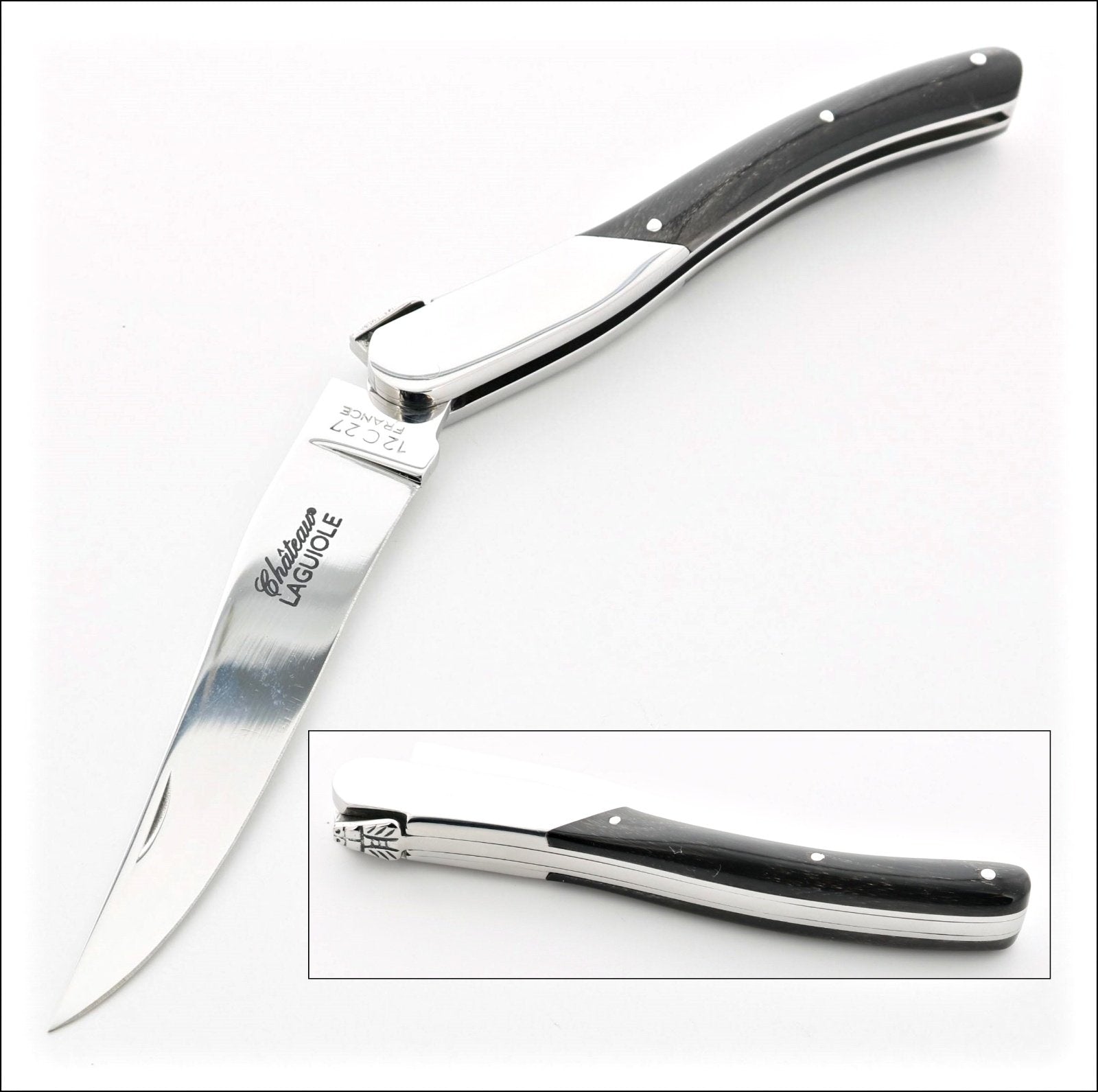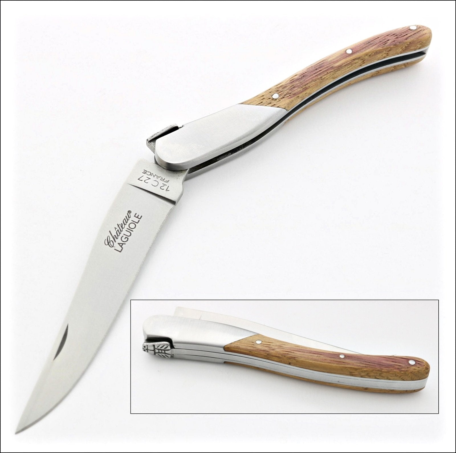 The Chateau Laguiole pocket knife combines the unique design elements of a classic waiter’s corkscrew with the iconic curves of a traditional Laguiole knife. Its minimalist and elegant design features a genuine Chateau Laguiole Grand Cru handle that lacks a bottom bolster, making the knife surprisingly well-balanced. You’ll appreciate how it feels in your hand, and like many French people, you might find yourself taking it to your favorite steakhouse. It is also the perfect size for everyday meals.