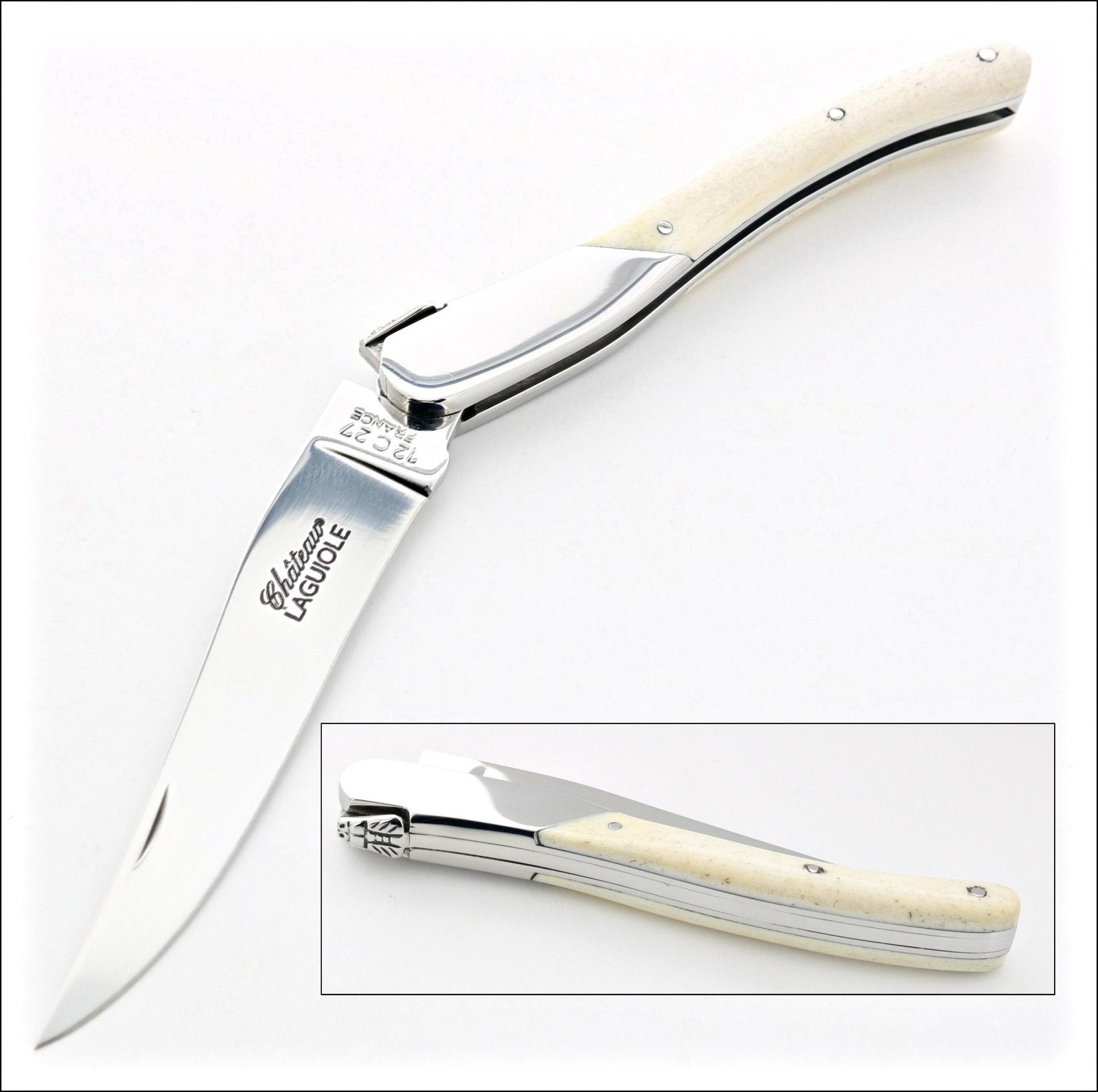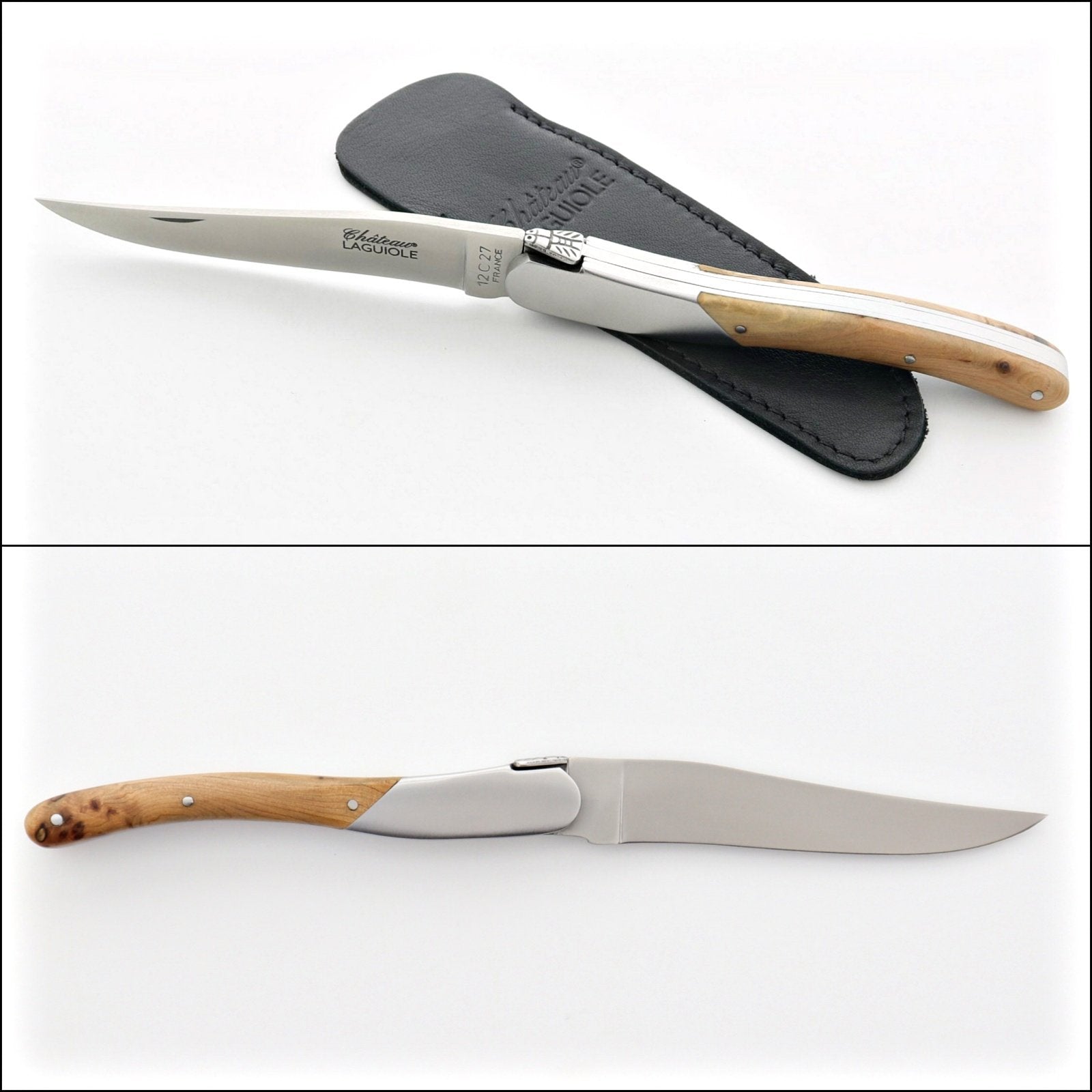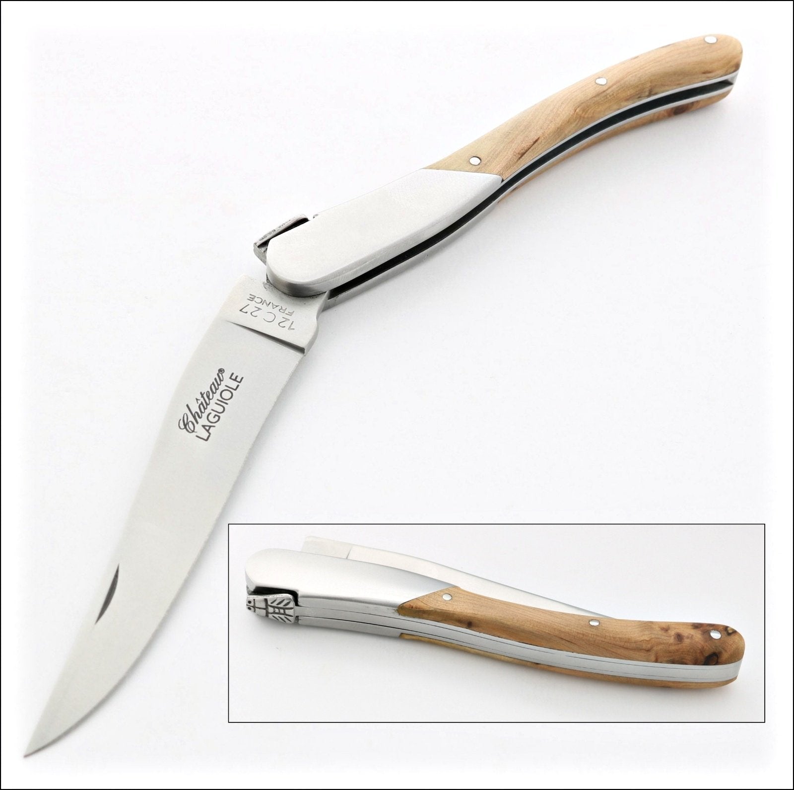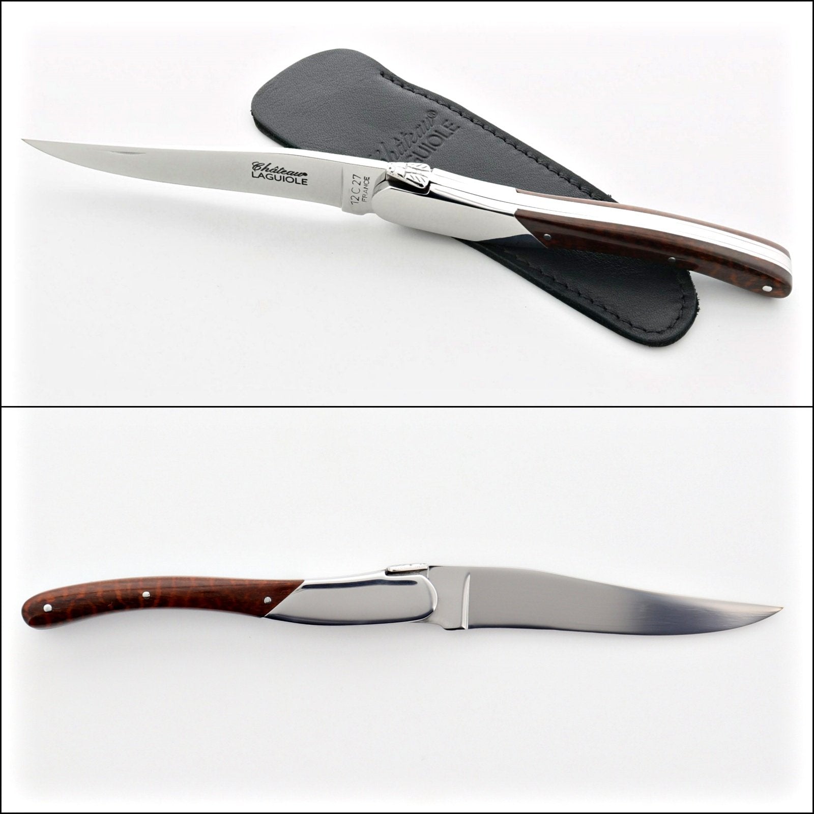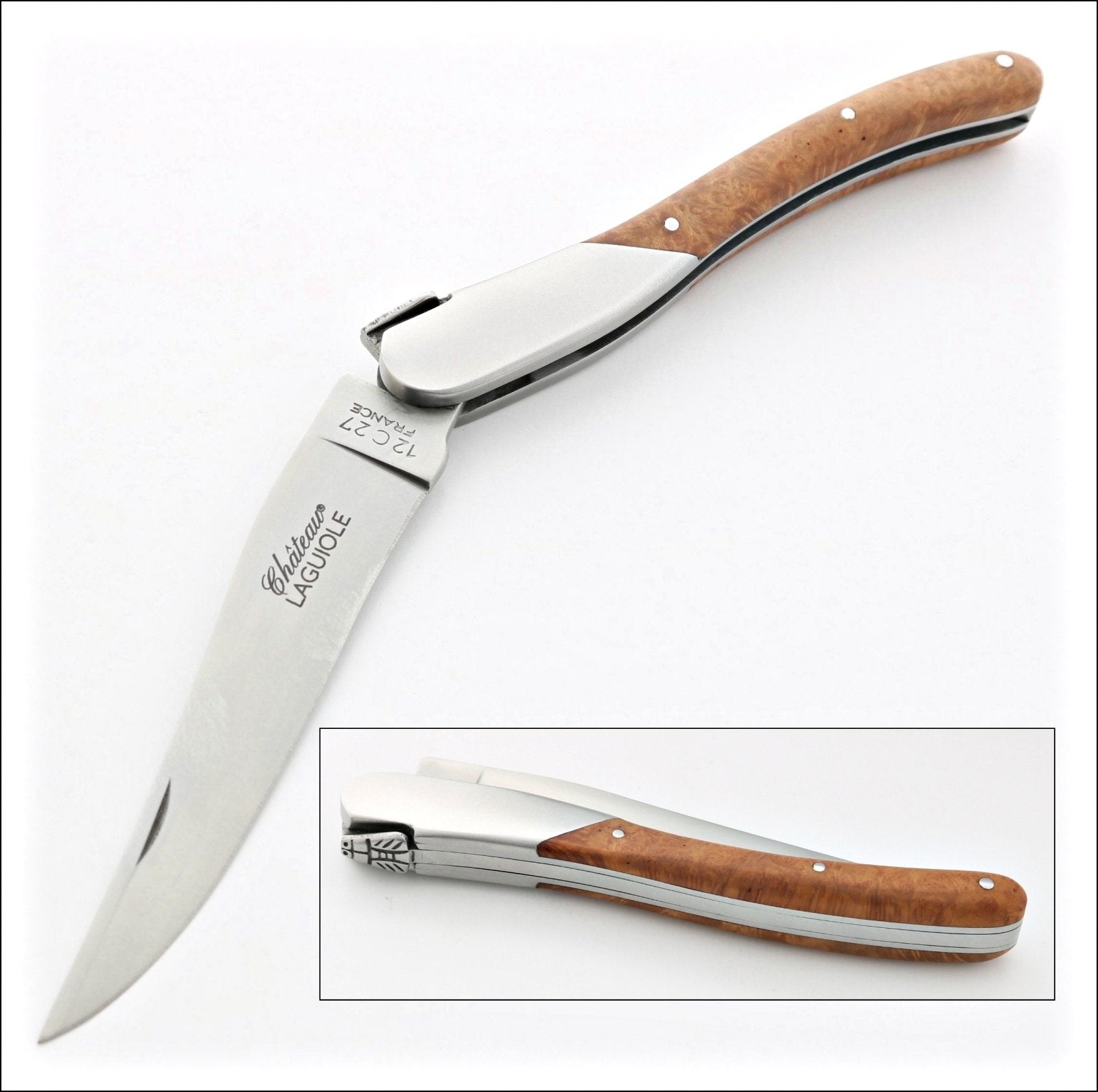 The Chateau Laguiole pocket knife combines the unique design elements of a classic waiter’s corkscrew with the iconic curves of a traditional Laguiole knife. Its minimalist and elegant design features a genuine Chateau Laguiole Grand Cru handle that lacks a bottom bolster, making the knife surprisingly well-balanced. You’ll appreciate how it feels in your hand, and like many French people, you might find yourself taking it to your favorite steakhouse. It is also the perfect size for everyday meals.