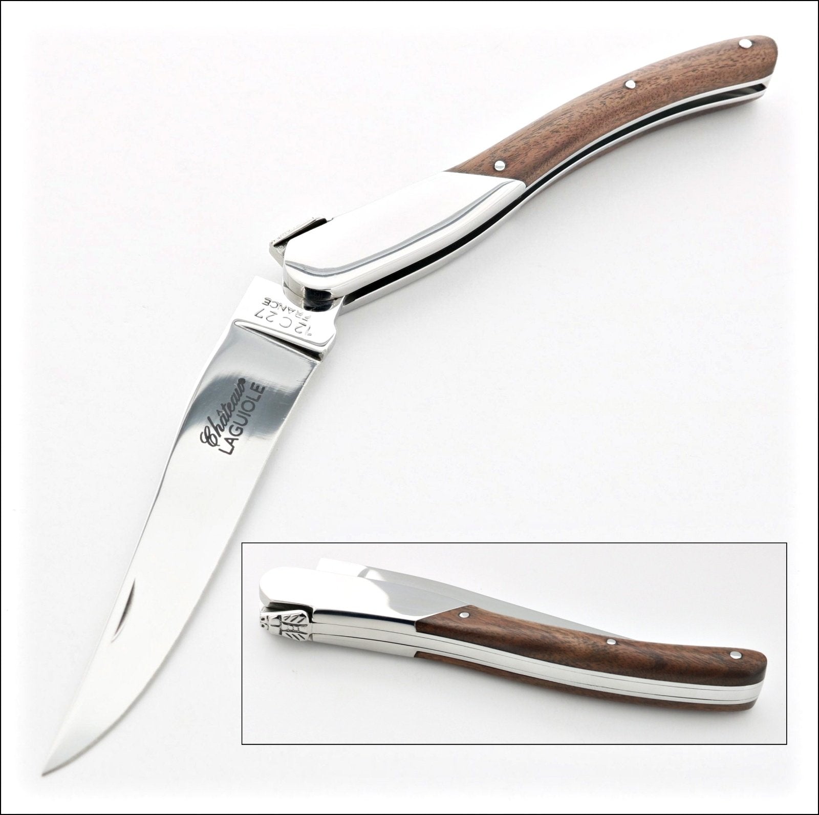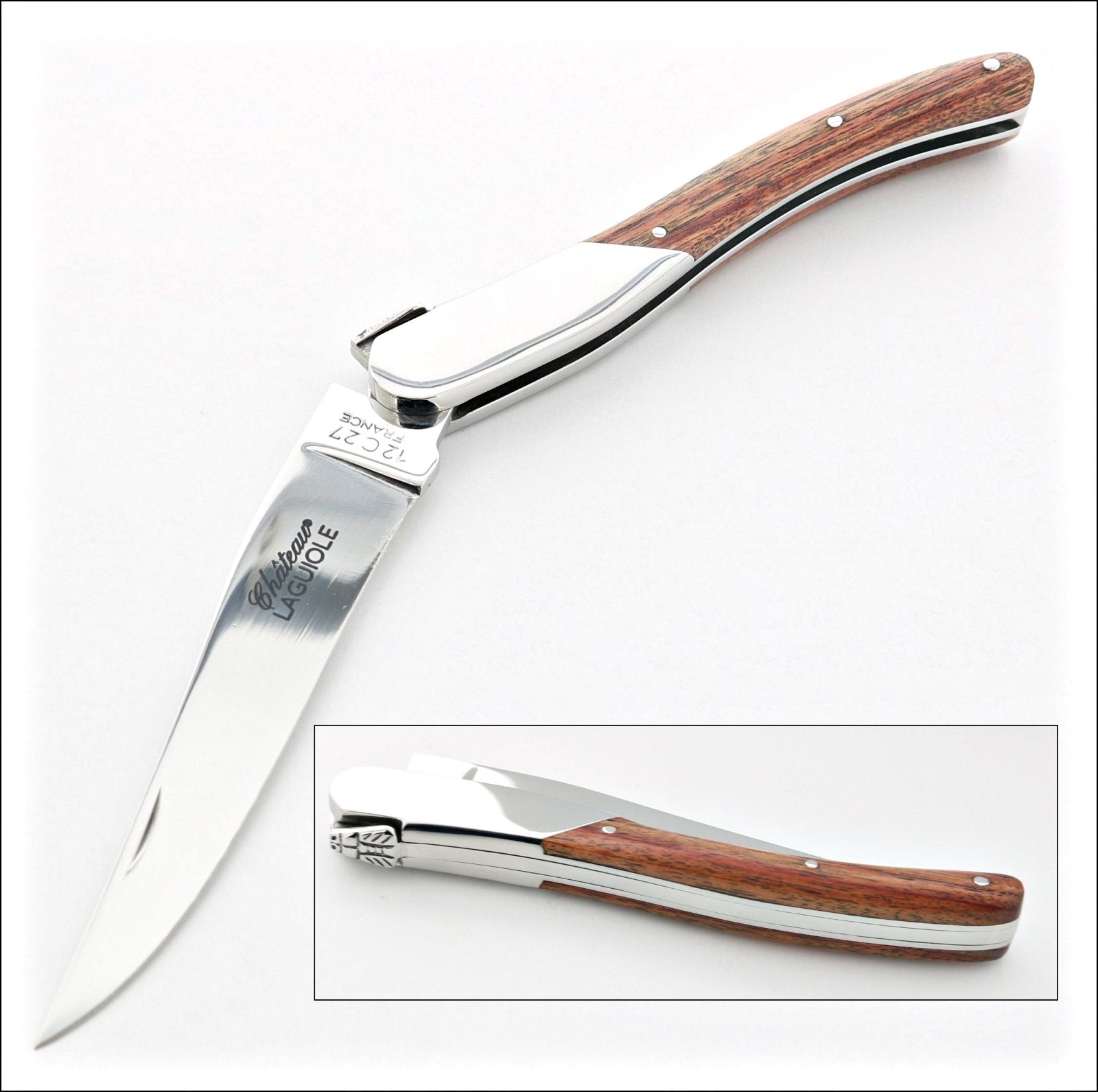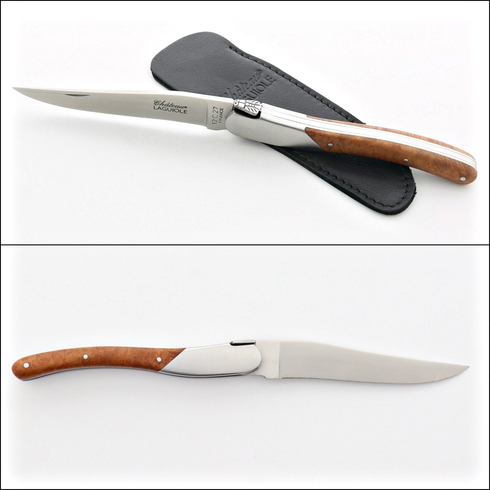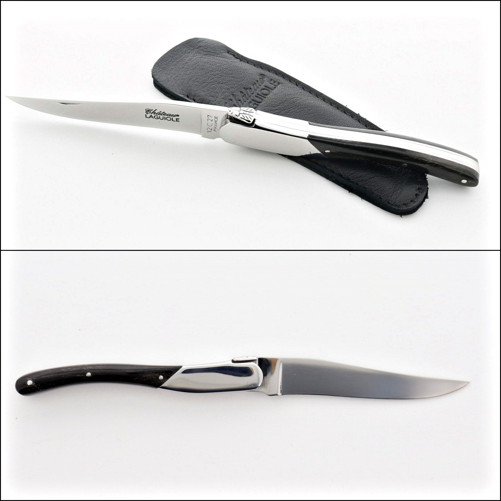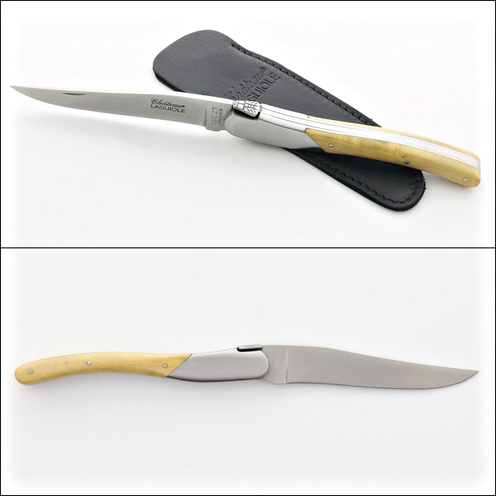 The Chateau Laguiole pocket knife combines the unique design elements of a classic waiter’s corkscrew with the iconic curves of a traditional Laguiole knife. Its minimalist and elegant design features a genuine Chateau Laguiole Grand Cru handle that lacks a bottom bolster, making the knife surprisingly well-balanced. You’ll appreciate how it feels in your hand, and like many French people, you might find yourself taking it to your favorite steakhouse. It is also the perfect size for everyday meals.