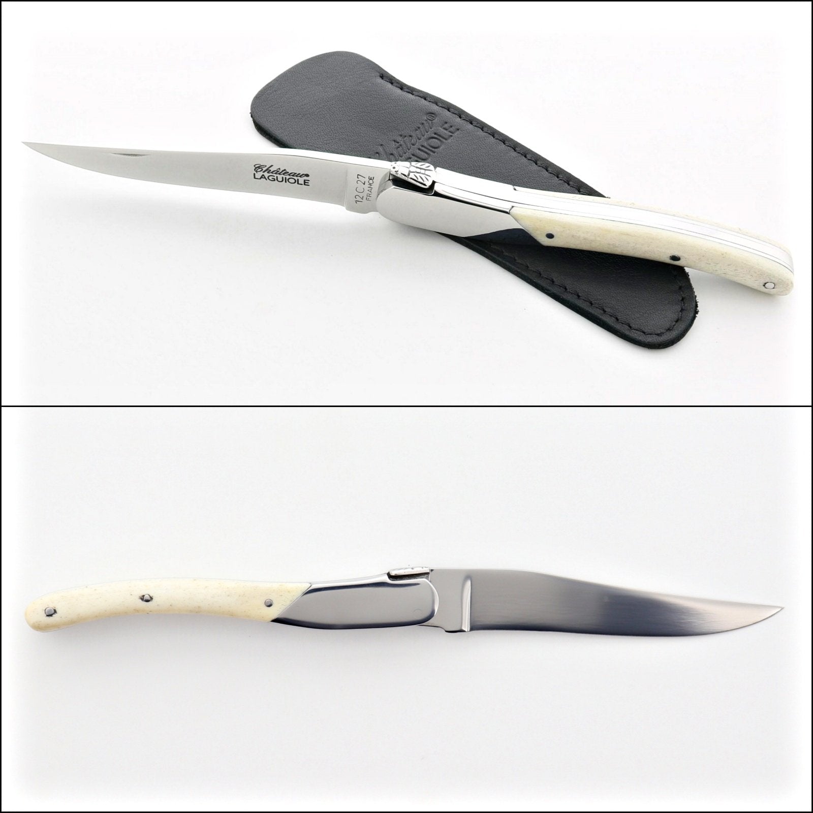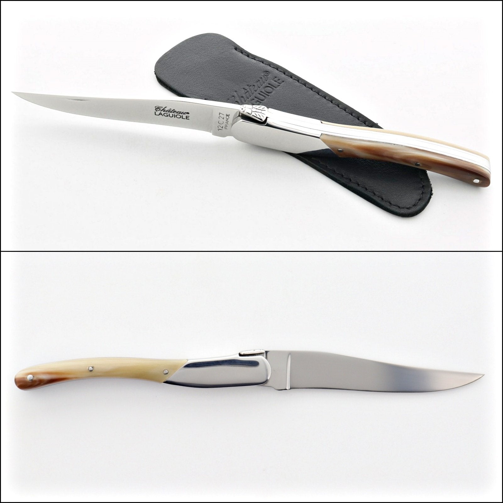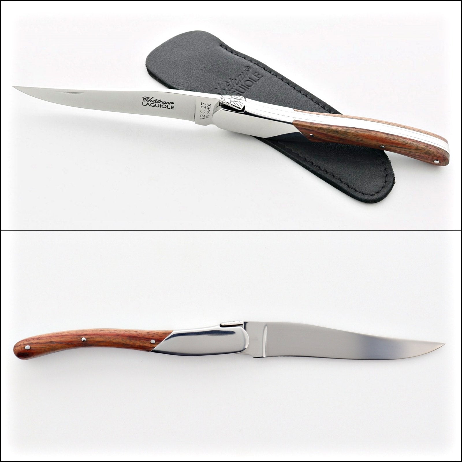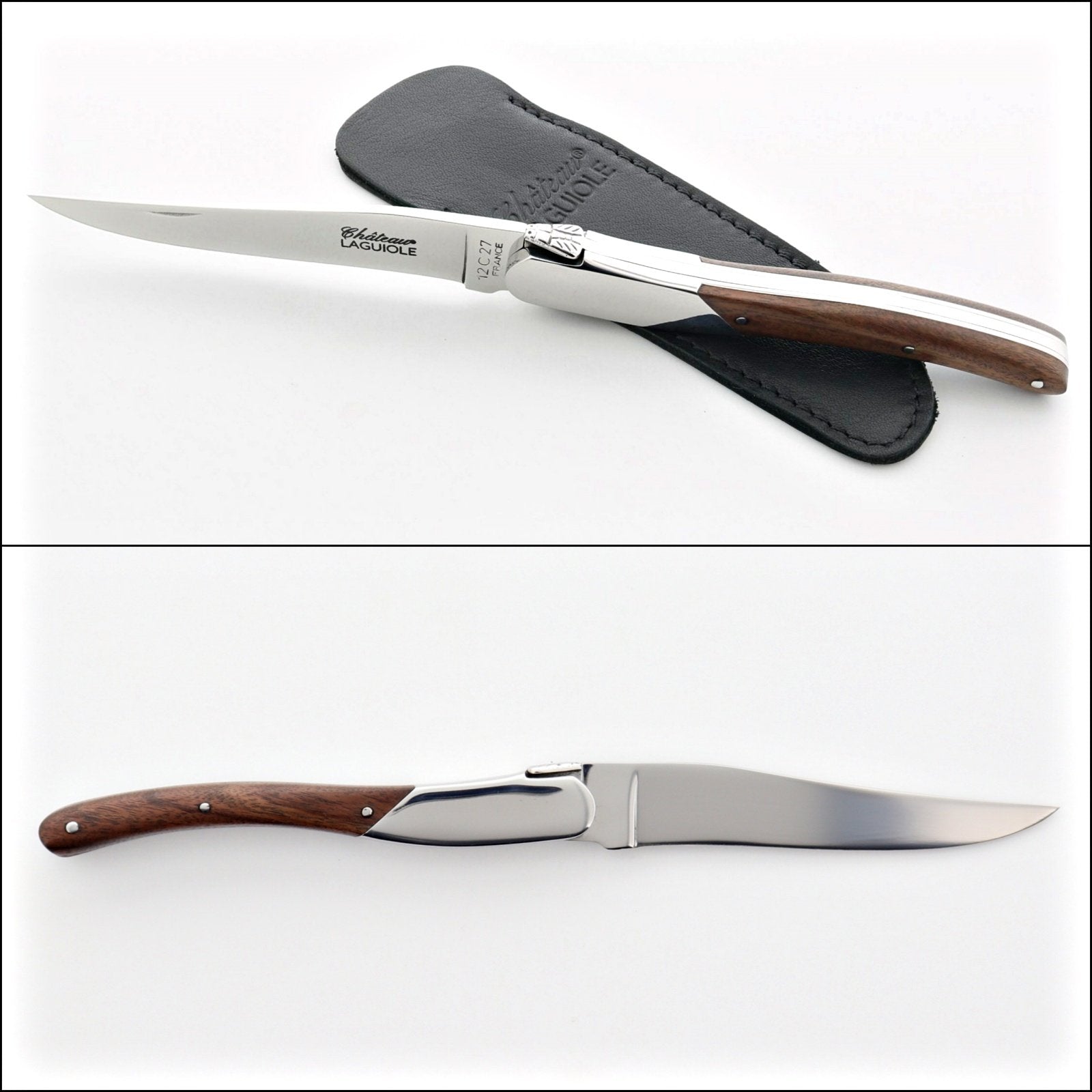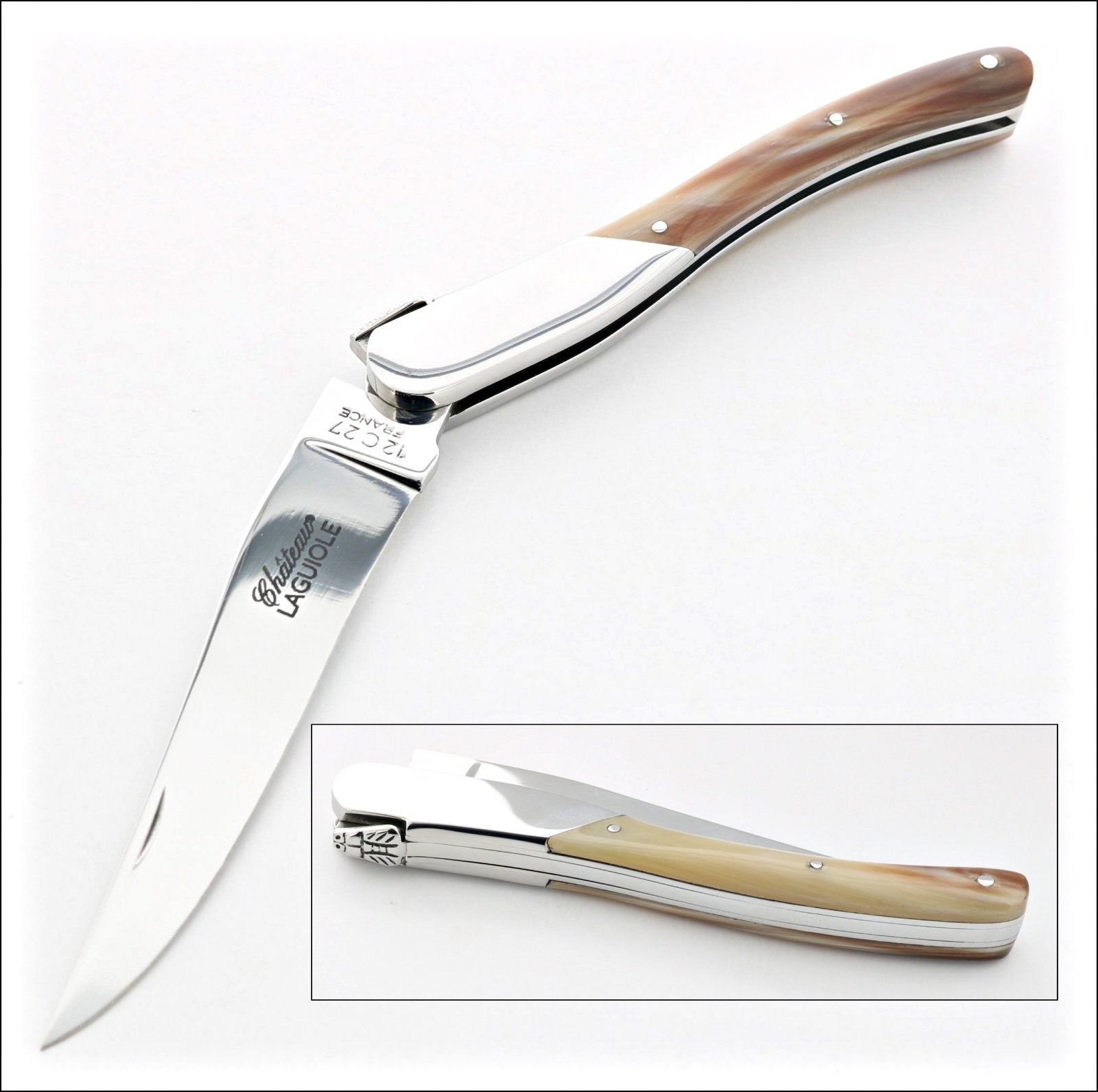 The Chateau Laguiole pocket knife combines the unique design elements of a classic waiter’s corkscrew with the iconic curves of a traditional Laguiole knife. Its minimalist and elegant design features a genuine Chateau Laguiole Grand Cru handle that lacks a bottom bolster, making the knife surprisingly well-balanced. You’ll appreciate how it feels in your hand, and like many French people, you might find yourself taking it to your favorite steakhouse. It is also the perfect size for everyday meals.