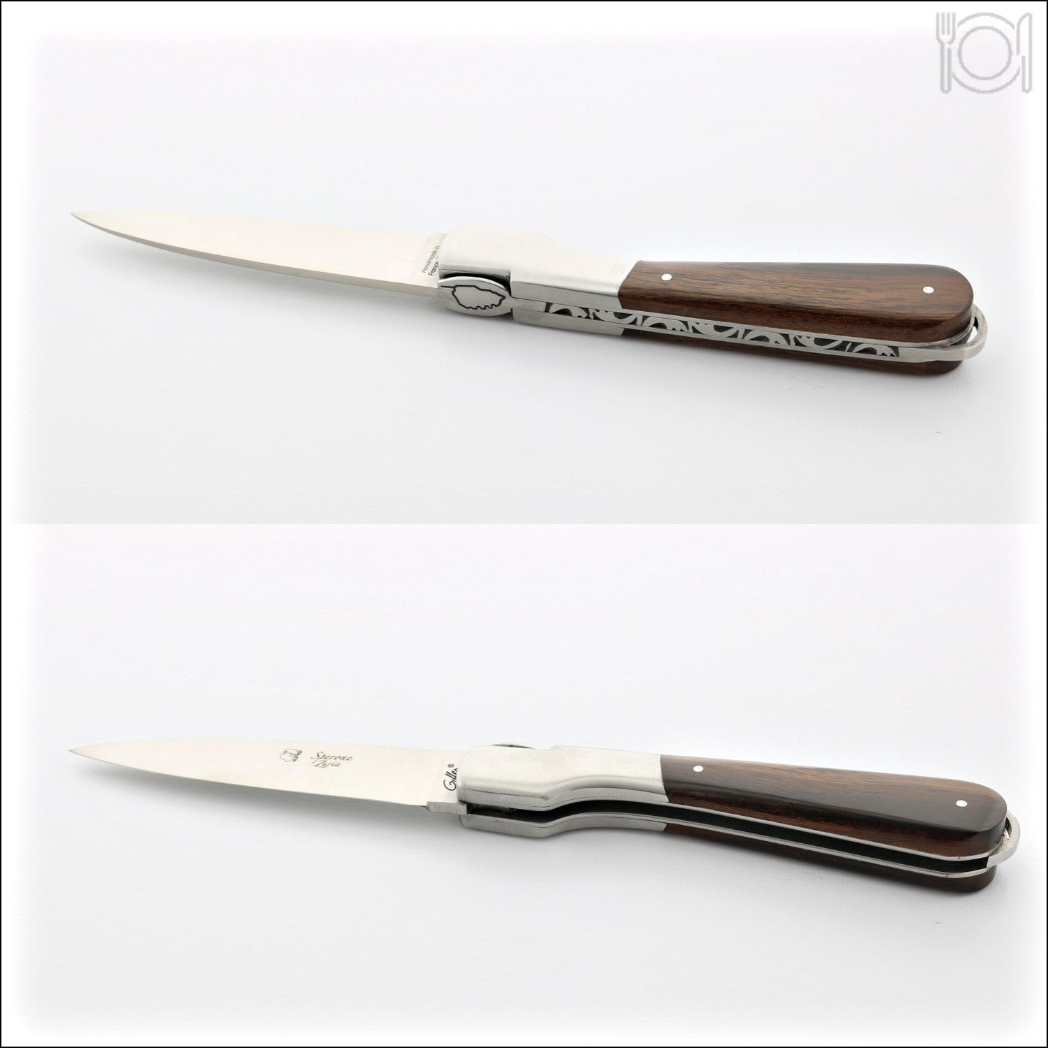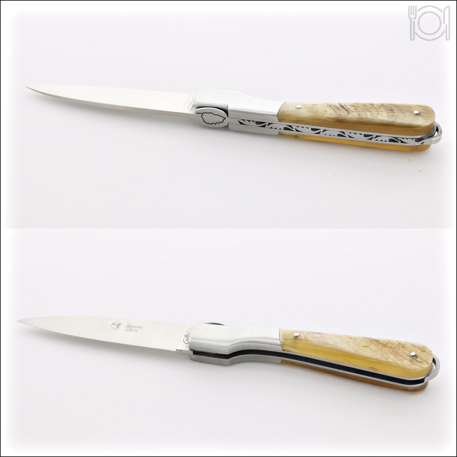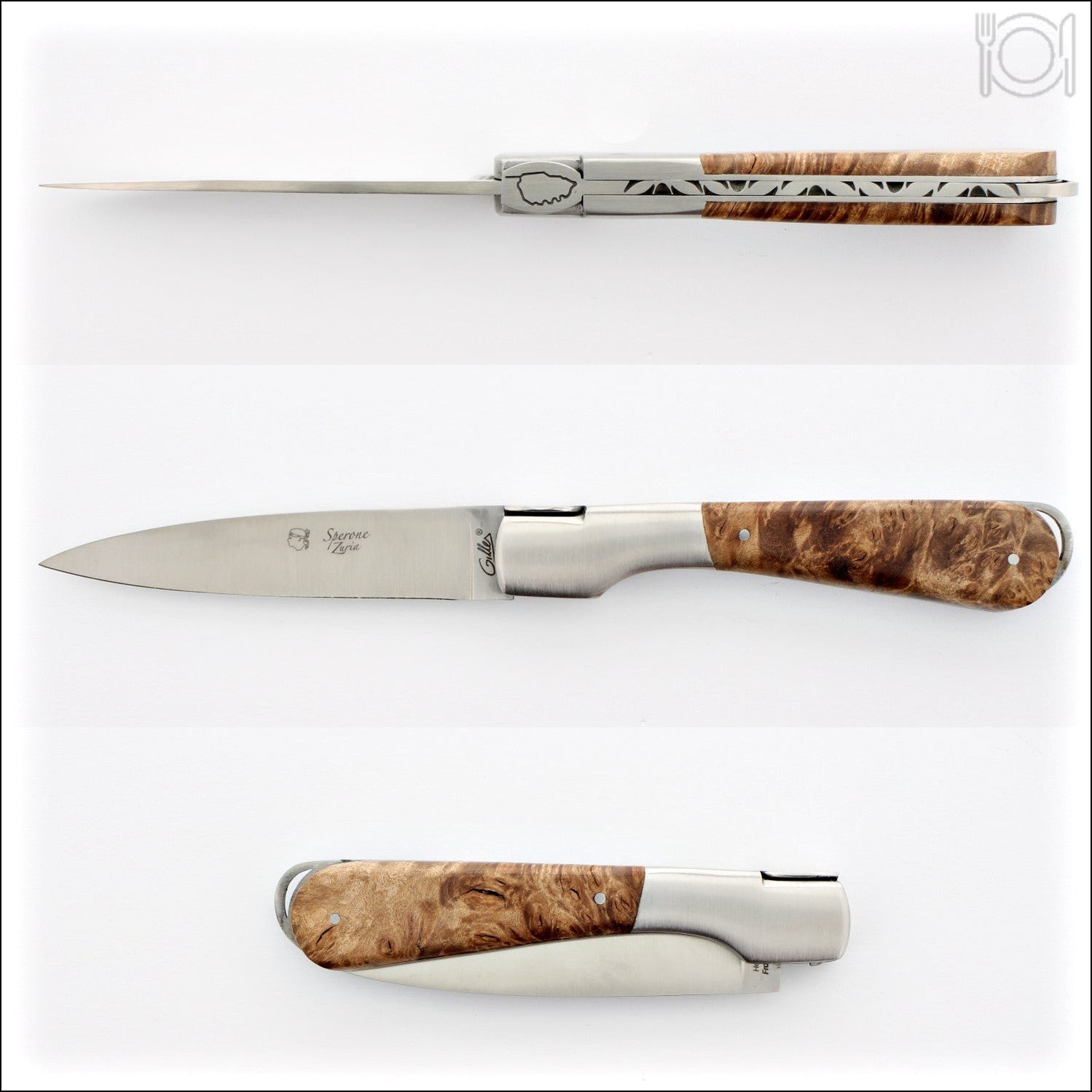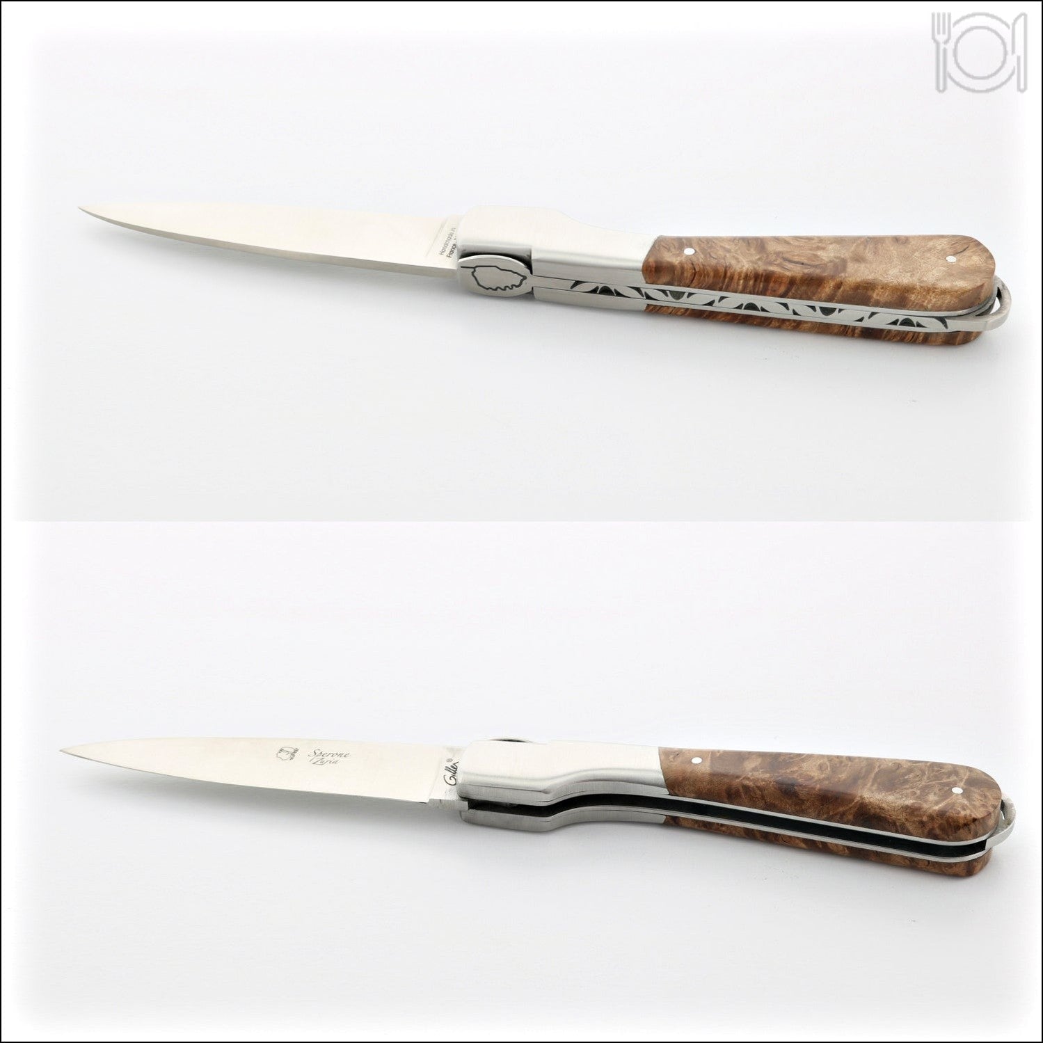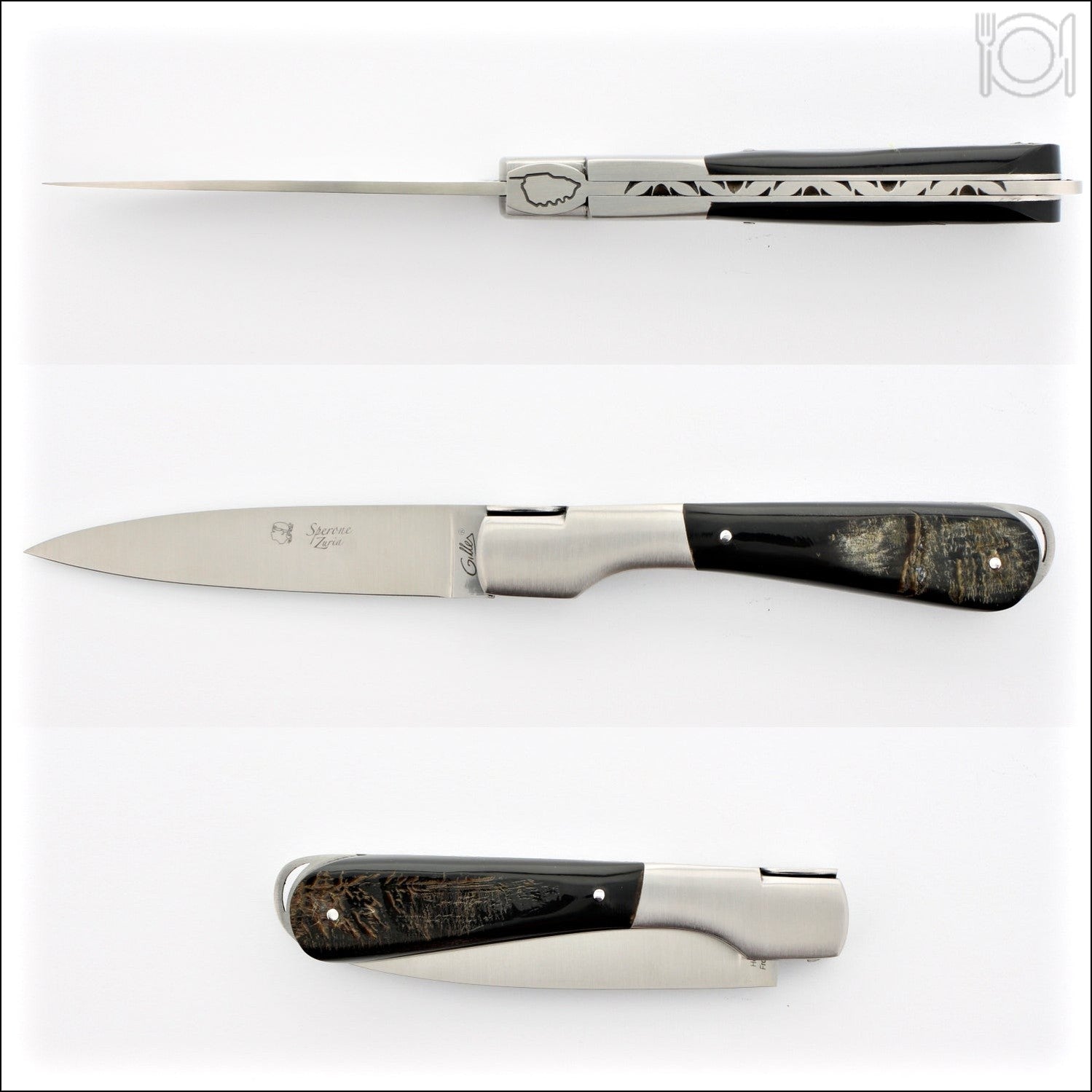 Introducing another exquisite addition to Fontenille Pataud's Corsican series: a highly ergonomic folding knife. Unlike the Rondanira knife, the Sperone 12 cm model showcases a modified single-edge spear point blade. However, please note that it is not meant for throwing purposes. With its considerable length, this knife serves as an excellent choice for daily use at the dining table. It's important to note that this is not a split-joint knife, and the blade cannot be folded unless the lock-back mechanism is pressed firmly.