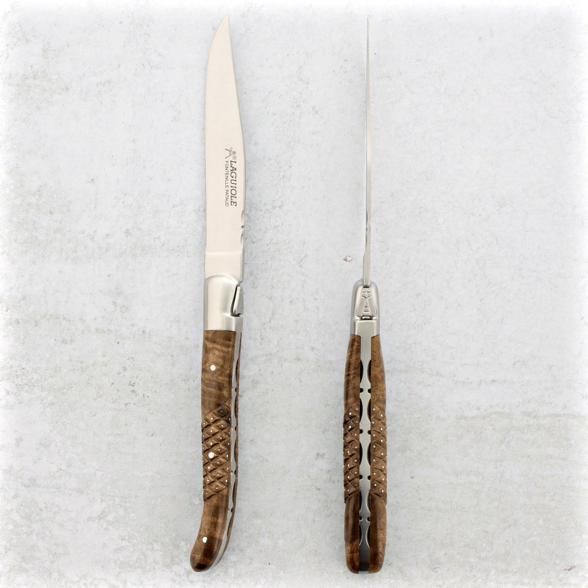 Studded Work: The intricate inlay work of stainless steel studs is completed by hand. This time-consuming process can only be carried out by Fontenille Pataud's most experienced artisans, making this beautiful diamond-shaped design an exceptional accomplishment. The knives are beautiful to look at and have a weight and feel that speaks volumes about the quality of artistry.