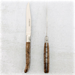 A single cold forged metal rod of Z40C13 Stainless steel is used to make each steak knife, giving them a unique quality among all other Laguiole table knives on today's market. Each knife top is hand filled with intricate designs.
