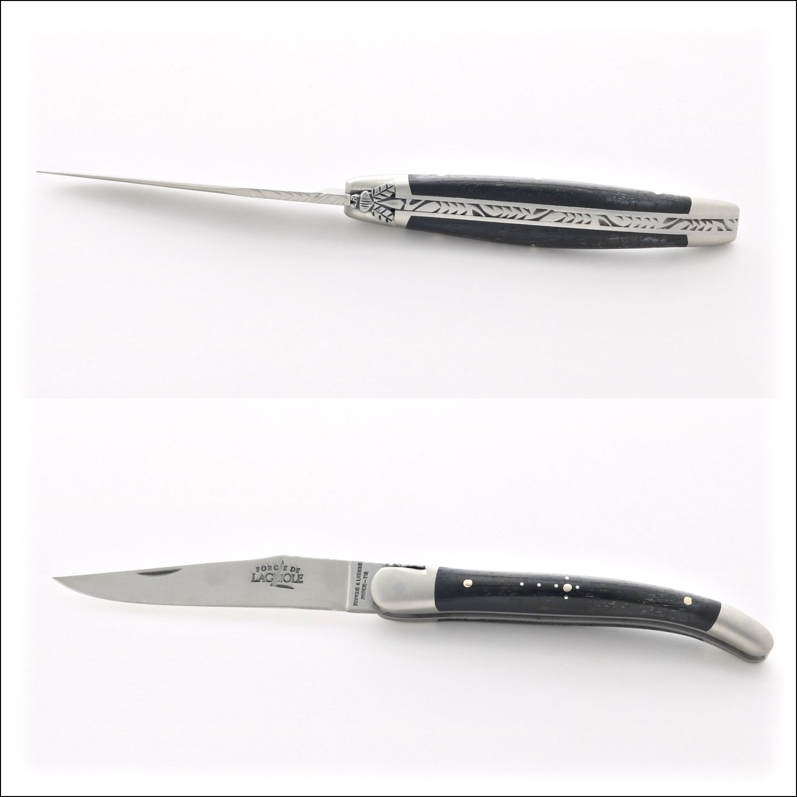 Known as "Pocket jewelry," the "Forge Collection" Laguiole pocket knives are the epitome of craftsmanship. Meticulously handcrafted by the most skilled and seasoned cutlers at the shop, each knife in this series showcases an astonishingly intricate chiseled spring and bee, requiring over an hour of meticulous work. These exceptional pocket knives transcend their utility as cutting tools; they are true works of art.