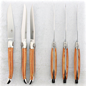 Forge de Laguiole table steak knives are manufactured in the village of Laguiole and feature the iconic bumblebee and the traditional shepherd's cross on most models. Forge de Laguiole represents the pinnacle of quality in the Laguiole cutlery business. Their reputation for integrity, ethics, and innovative designs has made these small 100 employees company the "Must Have" Laguiole luxury brand.