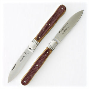 I have purchased in the past Boker knives with the beer barrel scales, and I really like this type of handle material. The Violin knife is even more visually appealing with the burgundy stain and medium brown hues. The fit in the hand is excellent. This has become one of my frequent edc rotation knives.