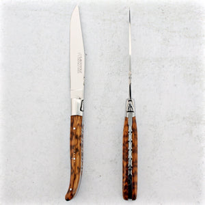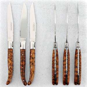A single cold forged metal rod of Z40C13 Stainless steel is used to make each steak knife, giving them a unique quality among all other Laguiole table knives on today's market. Each knife top is hand filled with intricate designs. The knives are beautiful to look at and have a weight and feel that speaks volumes about the quality of artistry.