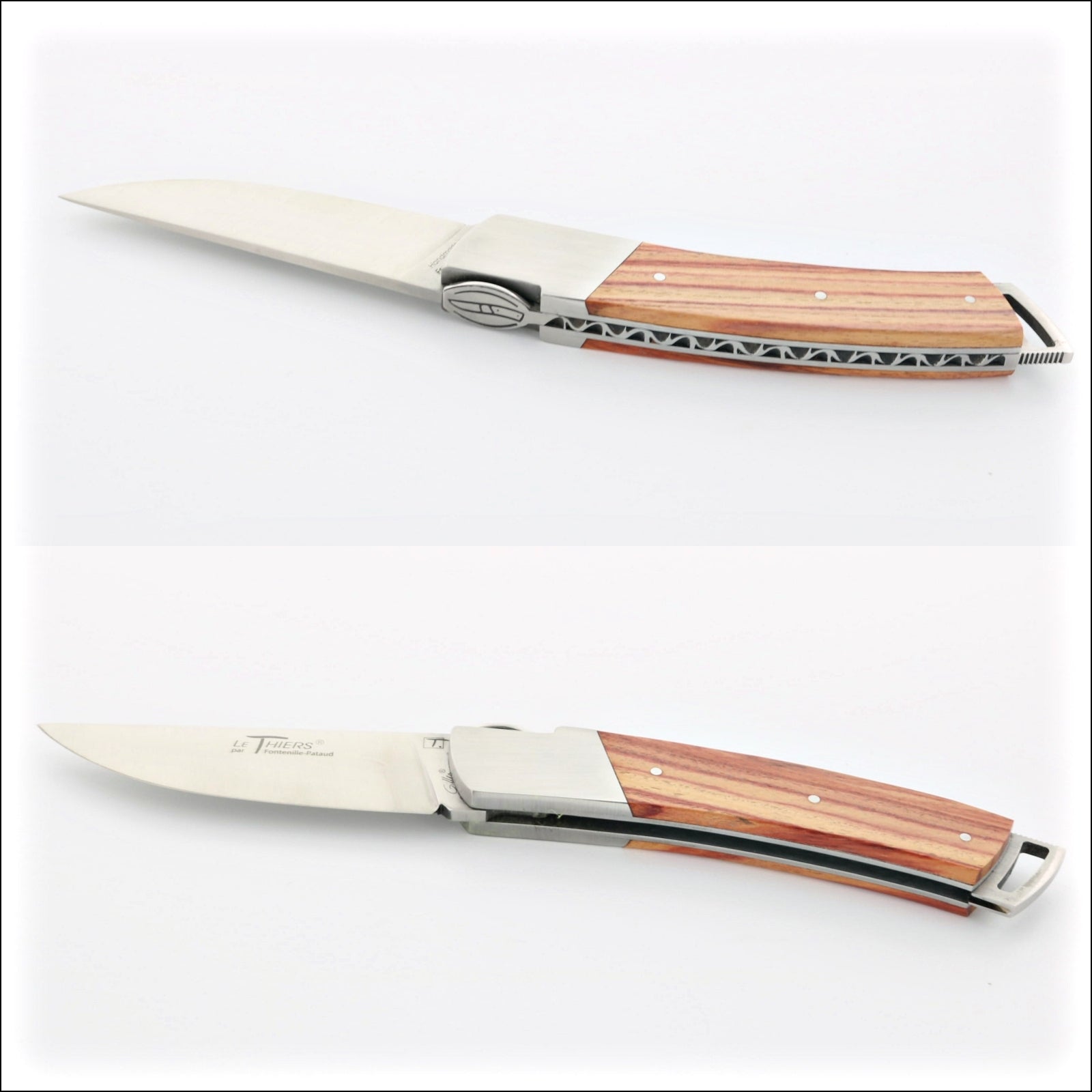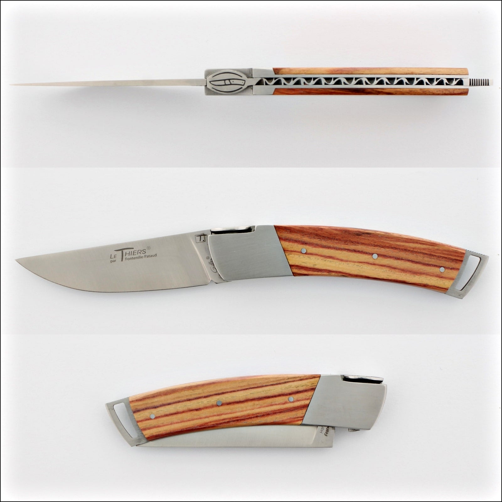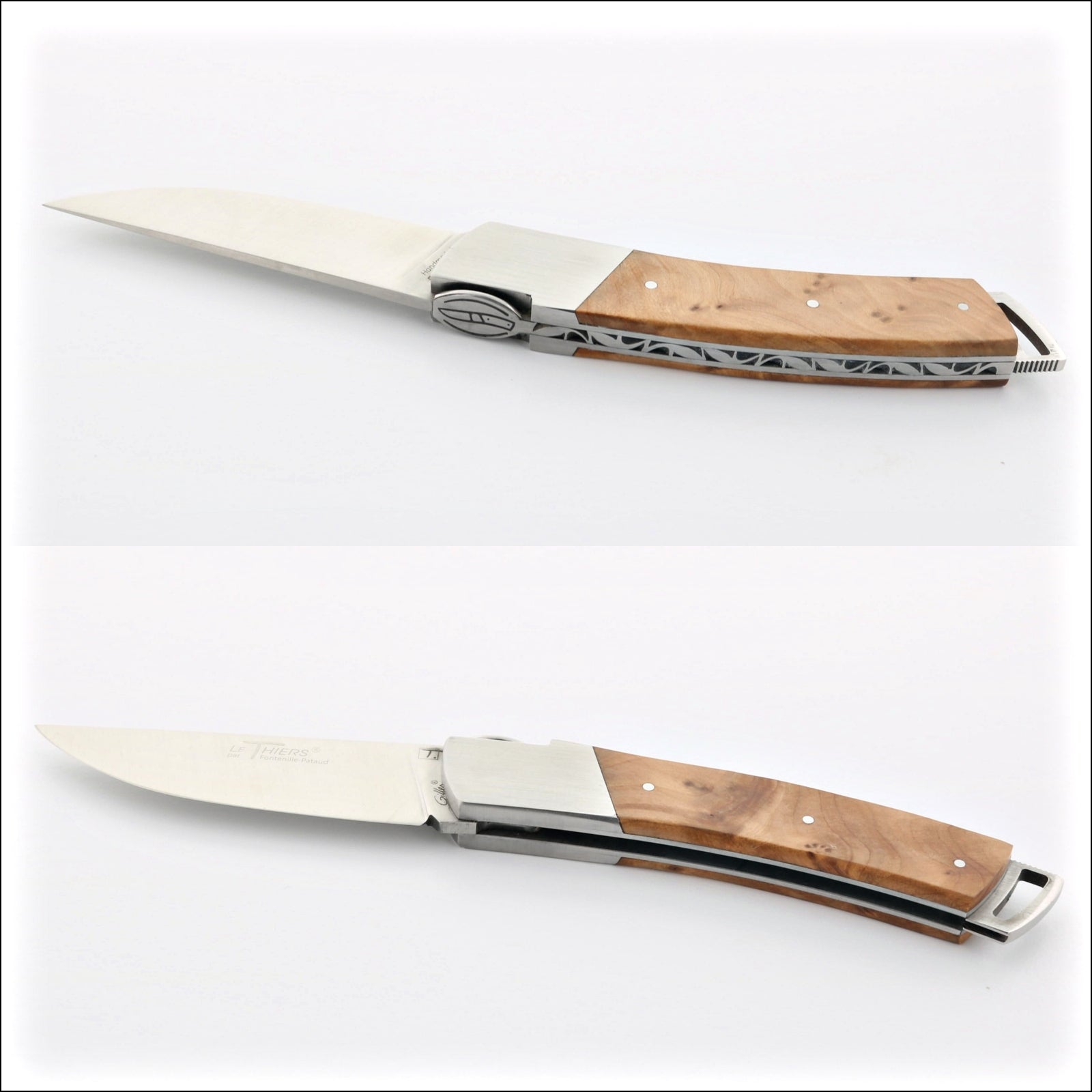This 12 cm handle Le Thiers Gentleman knife offers a good balance between the blade and the handle thanks to its special forged spring. A groove into the back of the spring allows the blade to fold in. Le Thiers Gentleman provides a secure locking blade, a smooth mechanism, and a solid blade stop to protect the blade's edge.