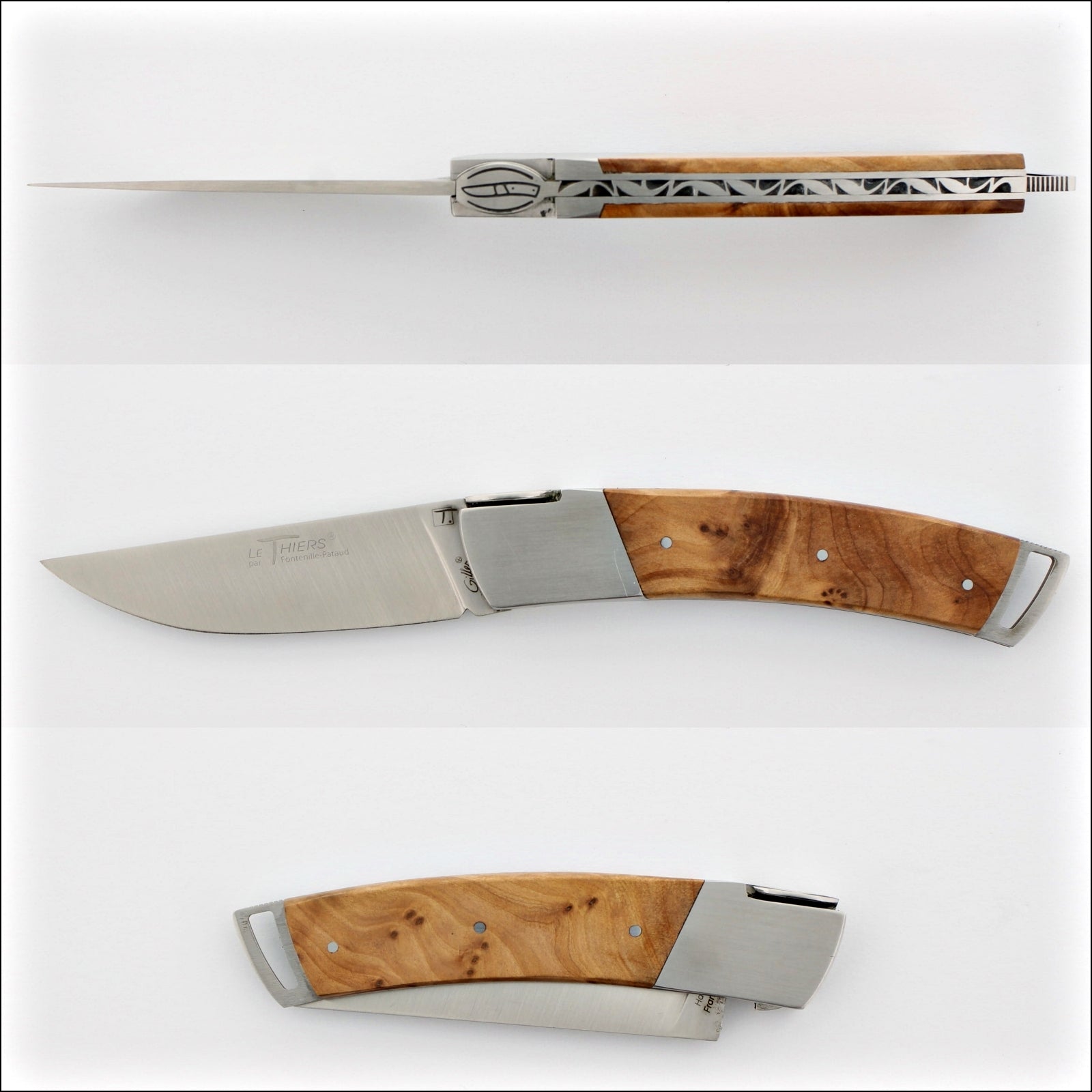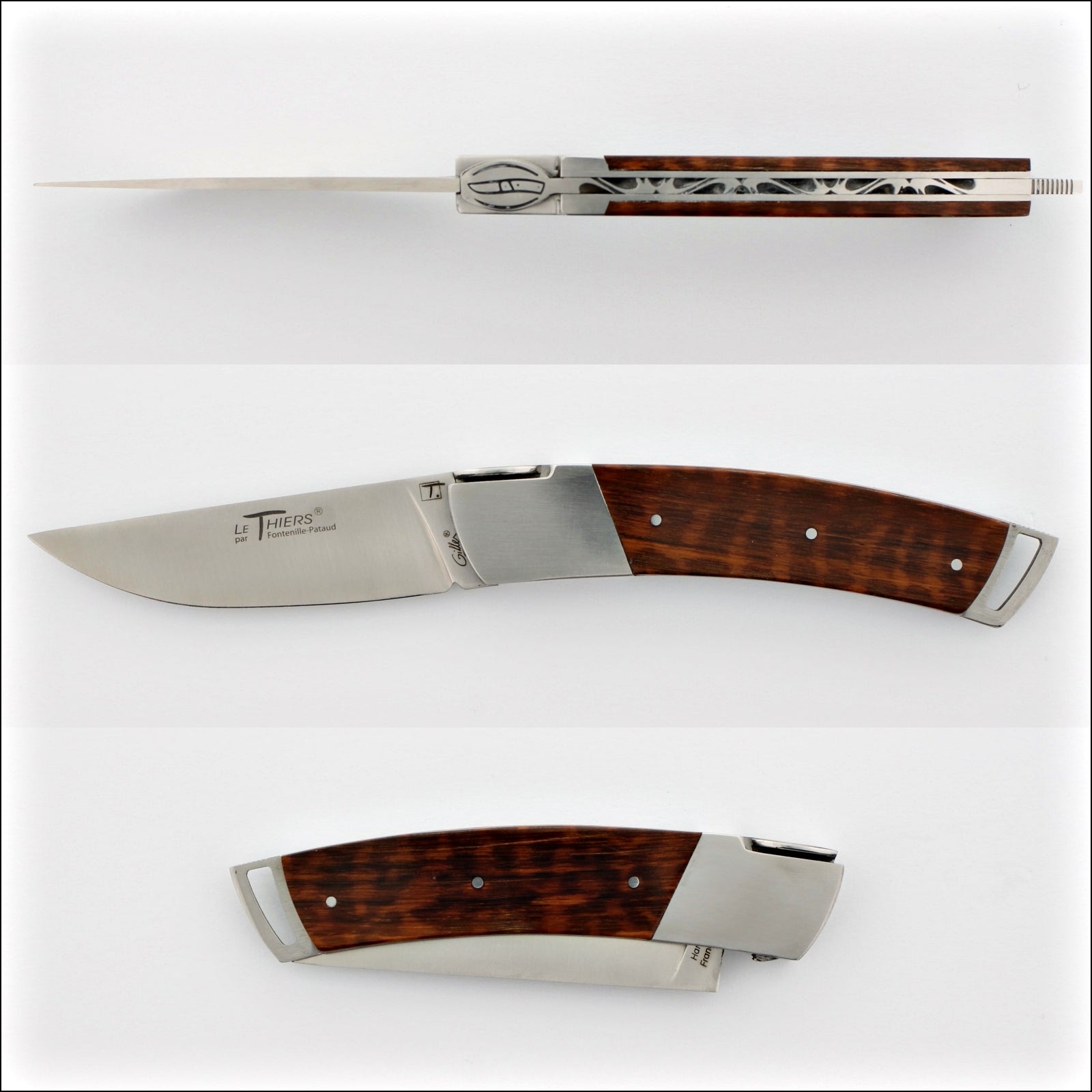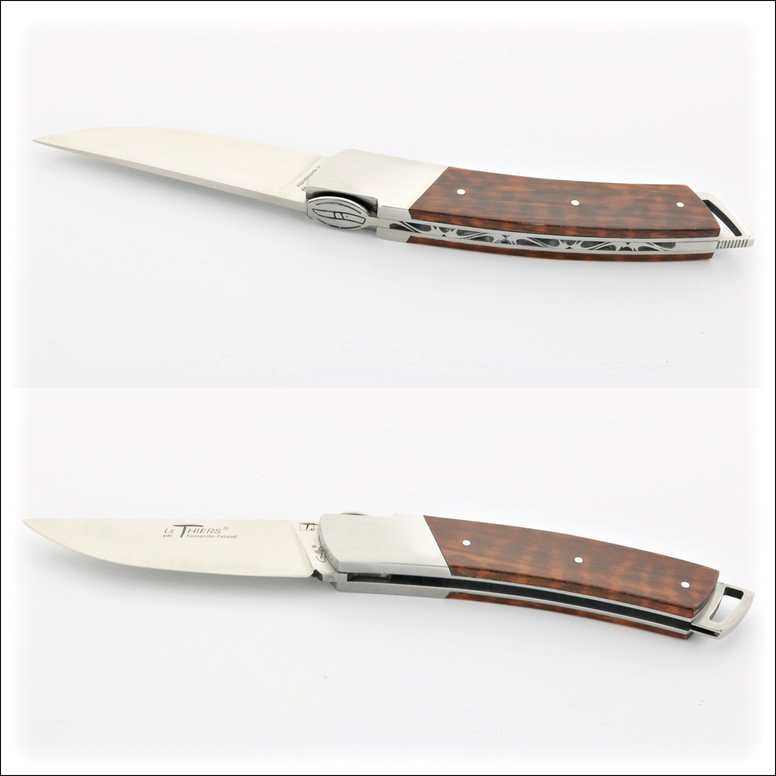 This 12 cm handle Le Thiers Gentleman knife offers a good balance between the blade and the handle thanks to its special forged spring. A groove into the back of the spring allows the blade to fold in. Le Thiers Gentleman provides a secure locking blade, a smooth mechanism, and a solid blade stop to protect the blade's edge.