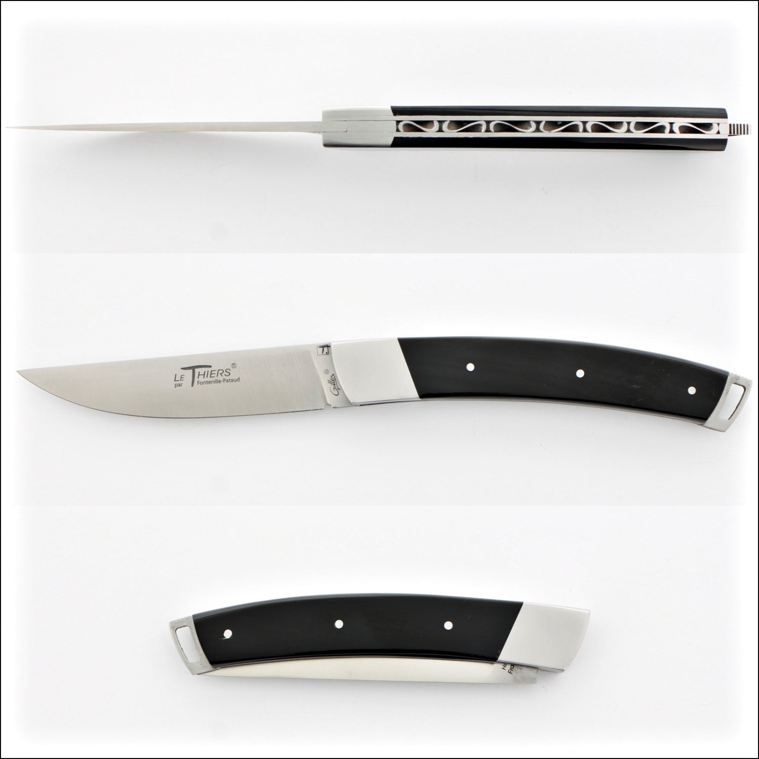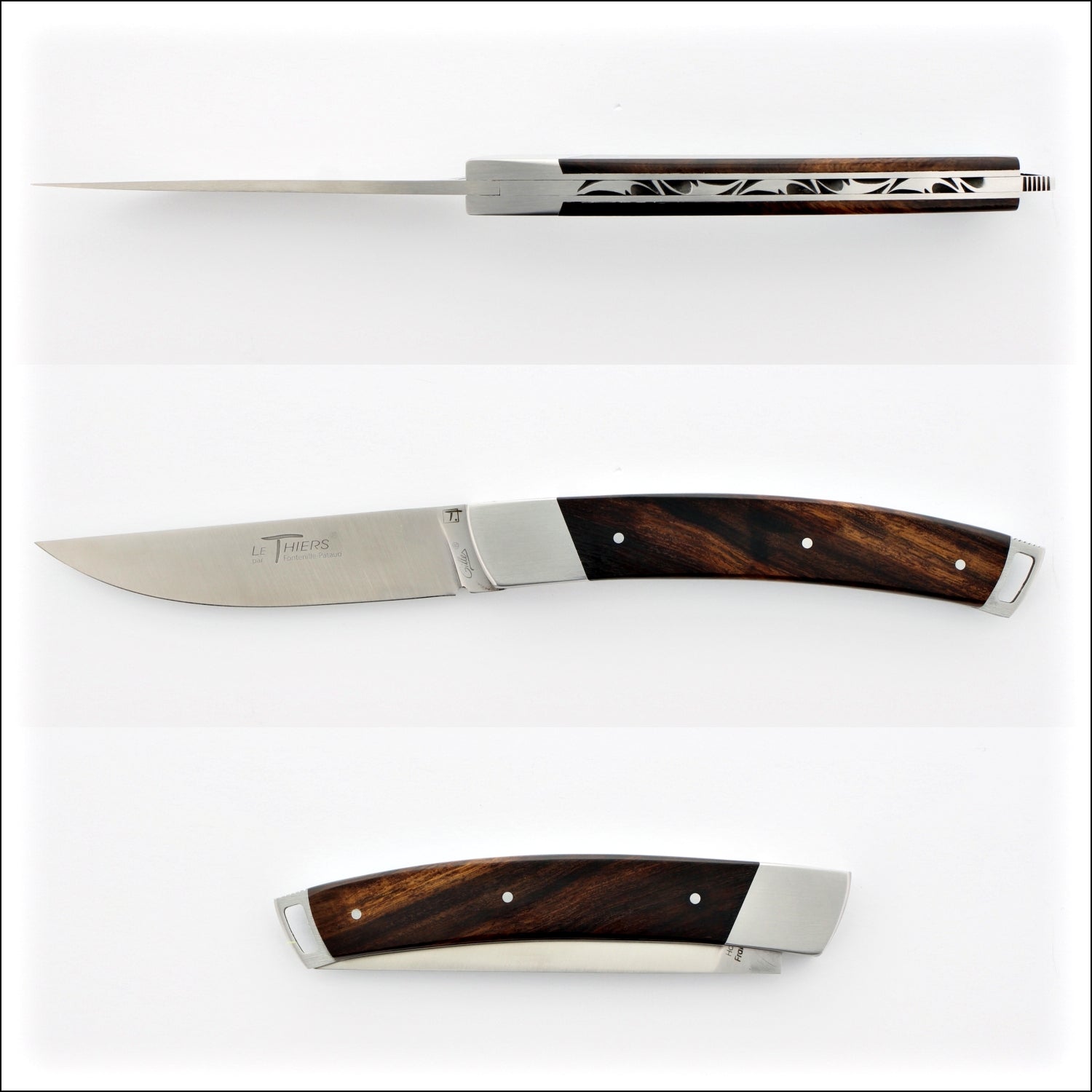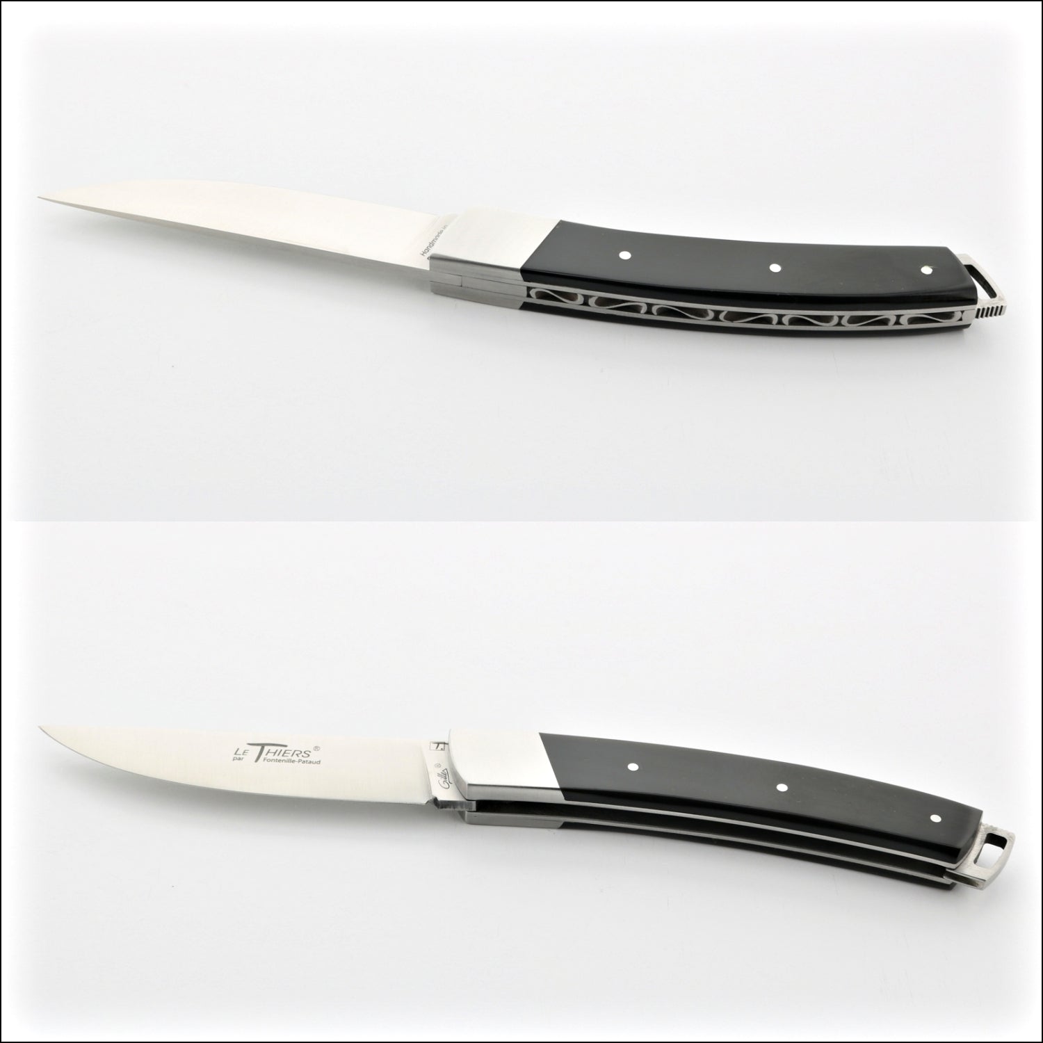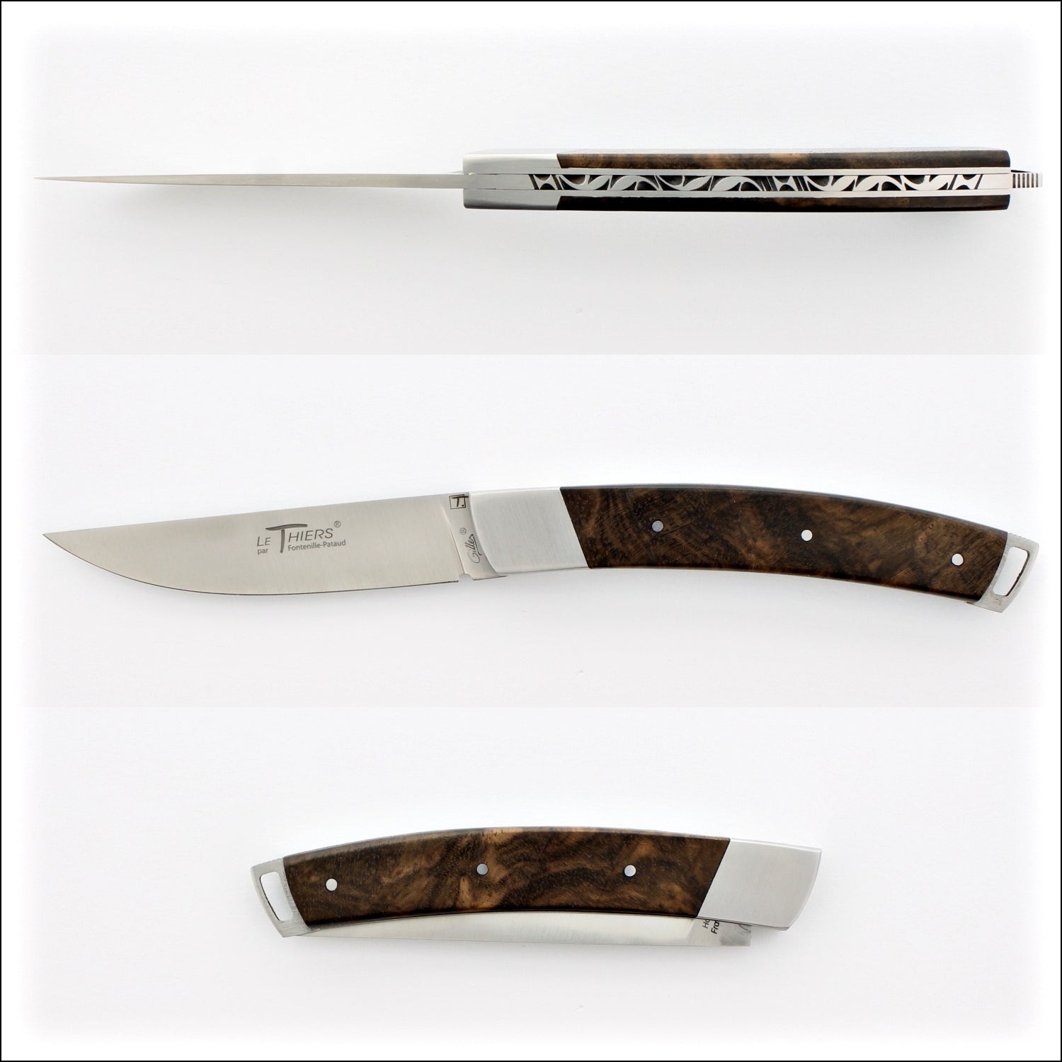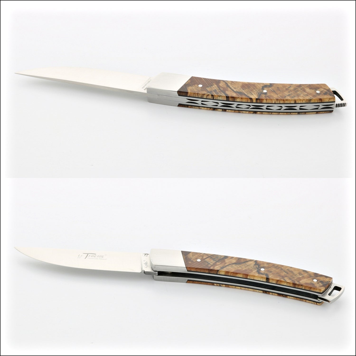 Le Thiers "Nature" pocket knife is a smaller & lighter version of the Le Thiers® Gentleman model. It will soon become your favorite Every Day Carry from your pocket to the restaurant. Le Thiers Nature offers a good balance between the blade and the handle thanks to its special forged spring. A groove in the back of the spring allows the blade to fold in. This pocket knife has a secure locking blade, a smooth mechanism, and a solid blade stop to protect the blade's edge when closing the knife.