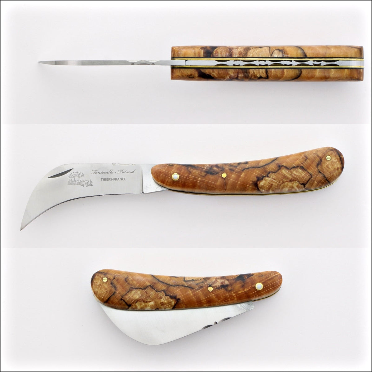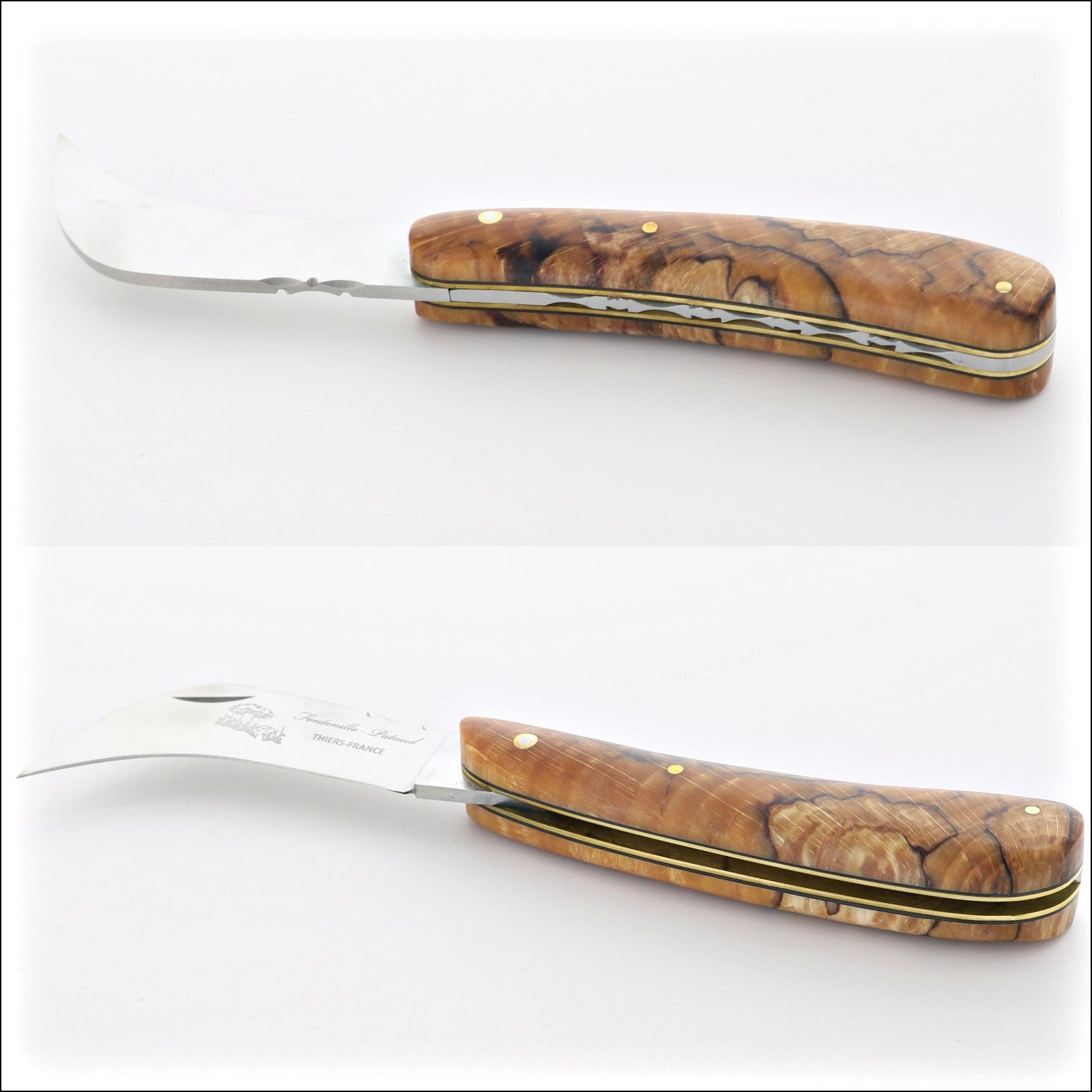 This Mushroom - Garden Knife was specifically created for mushroom picking, but it also excels as a garden and pruning tool. Unlike traditional knives, it has no bolsters, making it lightweight and nimble. The curved blade allows for a rocking motion, making cutting through stems, branches, and other plant matter effortless. This design is especially useful when harvesting fruits and vegetables. Its curved shape offers superior cutting performance, versatility, control, and less strain, making it a top pick among gardeners and foragers.