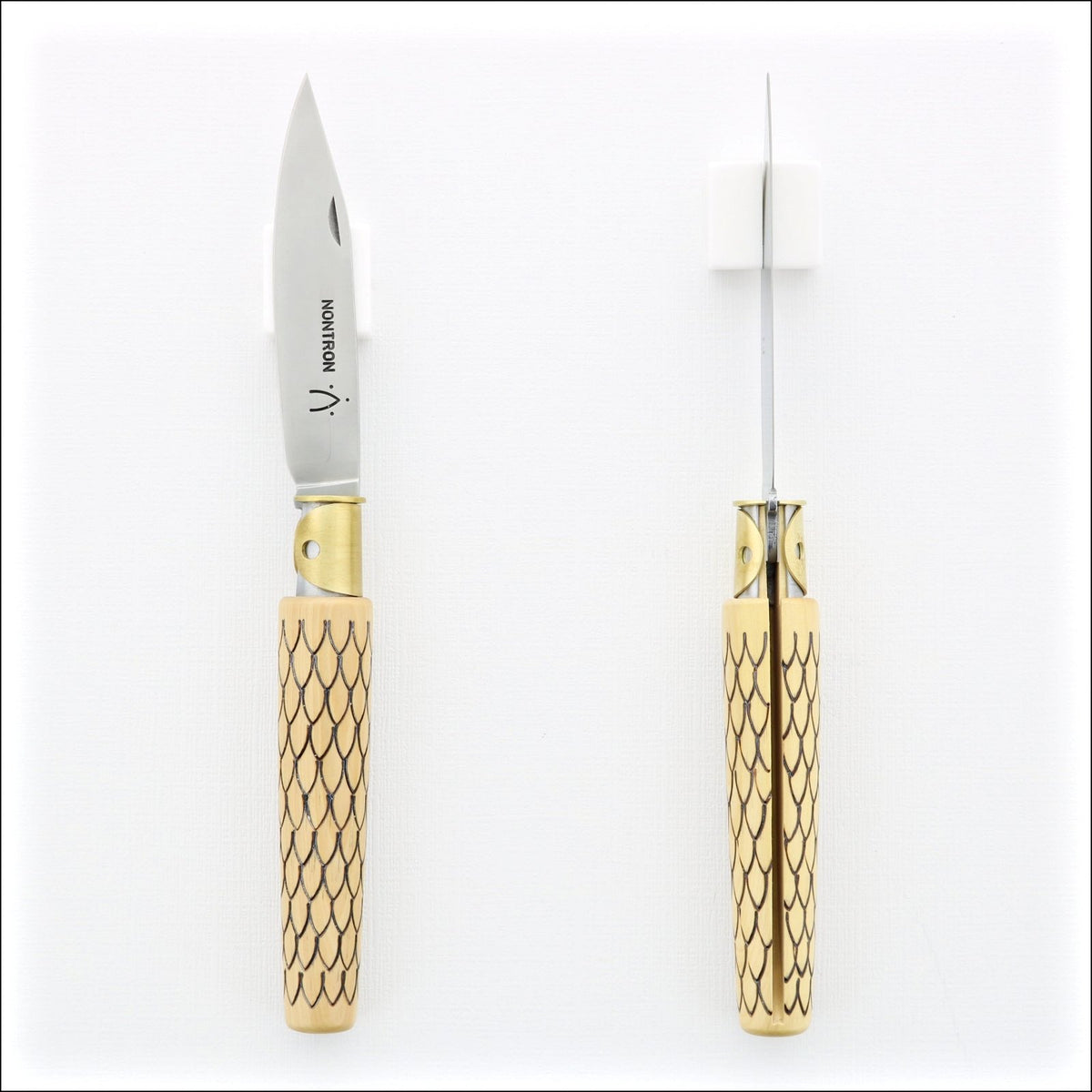 The Nontron knife shares the name of the French village of its birth located in the Dordogne department. This knife's history is filled with so many legends that it is difficult to date its exact origin; however, most experts agree that the Nontron knife is the oldest French folding knife dating back to the 13th century. Today, the cutlery that bears its name since 1928 produces handmade knives using ancestral methods. The procedures used to conceive todays' Nontron pocket knives are nearly the same since the fifteenth century.