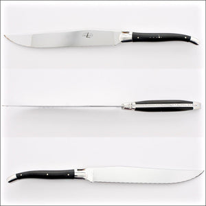 Introducing the Forge de Laguiole bread knife, crafted in the picturesque village of Laguiole, France. This exquisite knife showcases the iconic bumblebee and traditional Shepherd cross, adding a touch of authenticity to your kitchen.