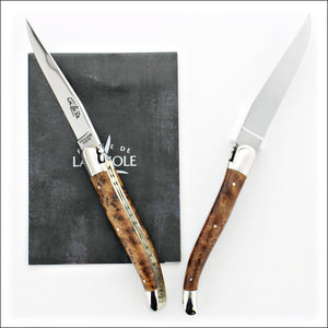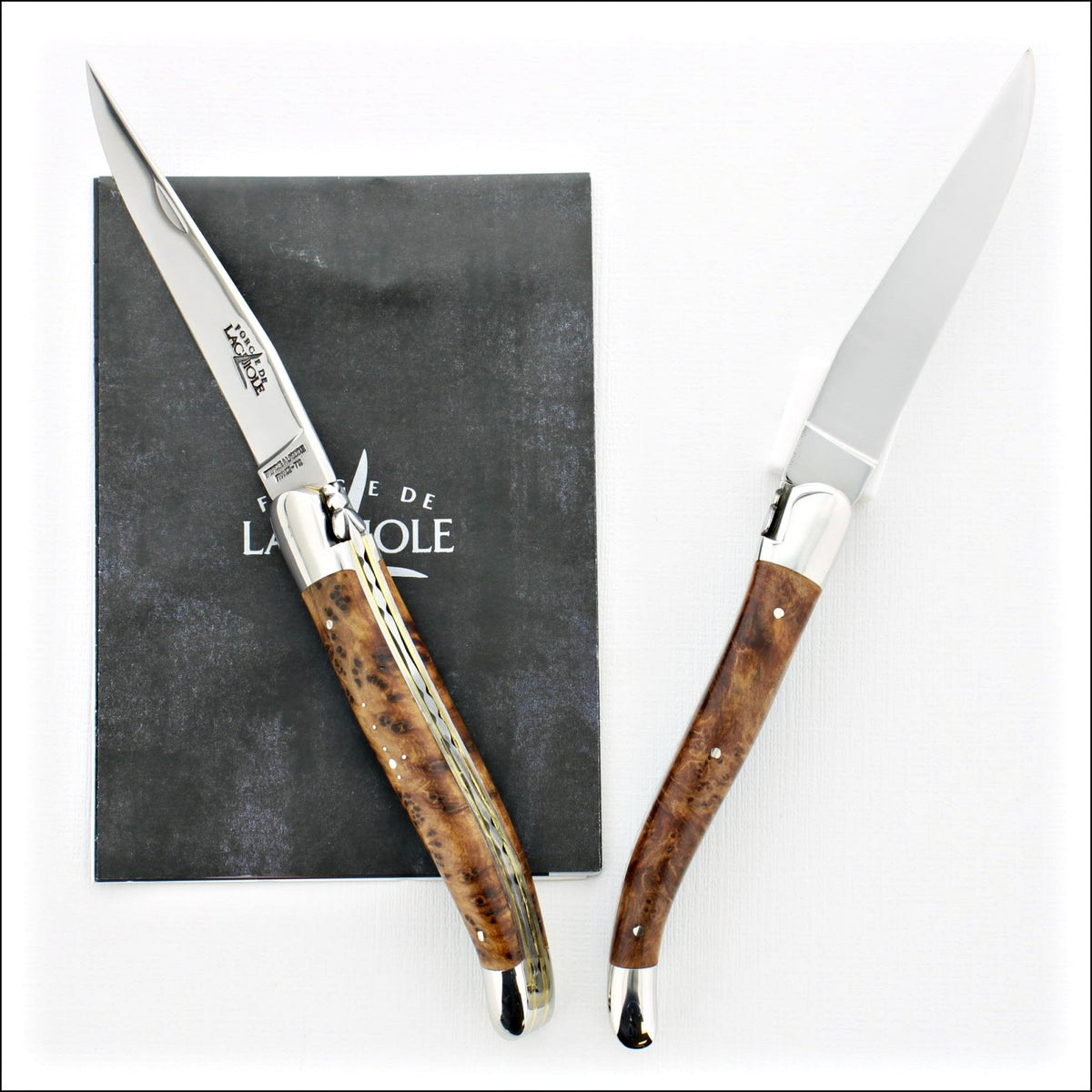 A 12 cm Laguiole folding knife can be used as a steak knife; its open length is 8. 3/4" vs. ~9" for a standard steak knife. Why use such a knife at the dinner table or your favorite steak house? Check out our article (new tab) for the surprising answer.