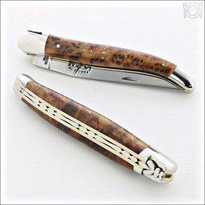 This particular knife was made in the village of Laguiole and is equipped with a forged bee and forged in-house blade. The handle is adorned with the traditional Laguiole shepherd's cross on the left side.