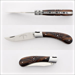 Technical aspects: The spring is made from 3 mm thick stainless steel Z20c13 and features a blade-stop that helps maintain the blade's edge. The "Shamrock," as well as the handle's top, are hand-chased with a file: This denotes artisan quality, unlike mass-market knives that have welded springs and are machine decorated. The file work details create a unique knife, making each knife one of a kind.