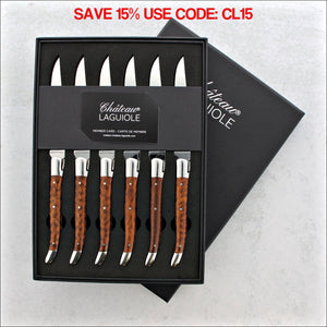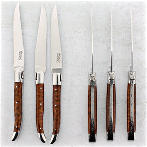 Laguiole steak knives have become a popular choice for elegant dining due to their high quality and distinctive design. These knives were first crafted in the early 19th century in the French village of Laguiole, from which they got their name. They are known for their unique features, including a slender, tapered blade and a curved, ergonomic handle, which provide excellent functionality and comfort during use.Snakewood aka Amourette (Brosimum guianense) is a gorgeous wood that originates mostly from Brazil's Suriname valley.