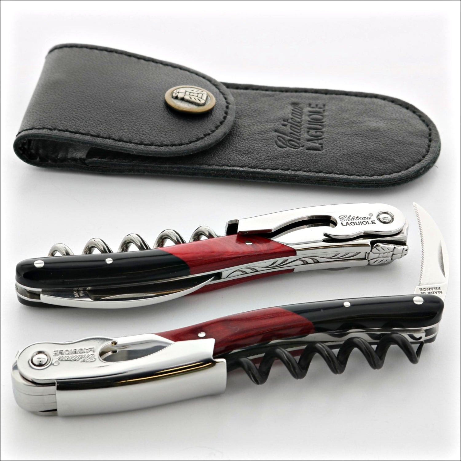 The stunning Chateau Laguiole corkscrew featuring a red and black design is inspired by the classic French novel "Le rouge et le Noir" (The Red and the Black).