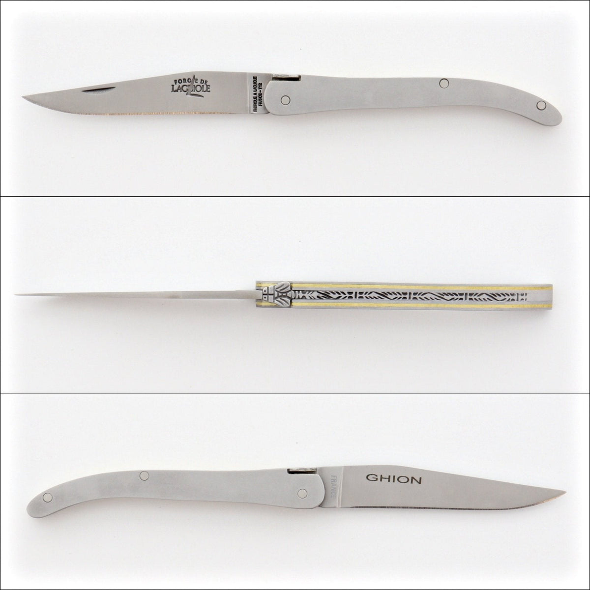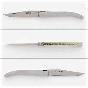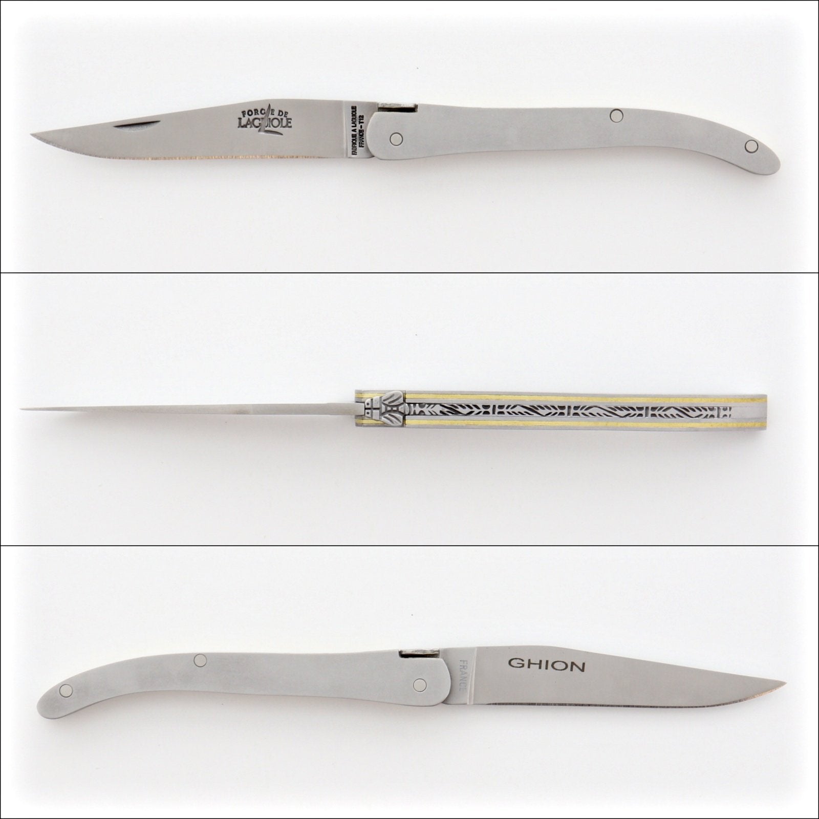 This small contemporary Laguiole knife is the brainchild of famed designed Christian Ghion. This everyday carry folder features the Laguiole's classic lines with the added touch of modern design Mr. Ghion is known for. If you are looking for a unique knife, look no further; this knife is priced right and is small enough to be placed in any pocket or bag.