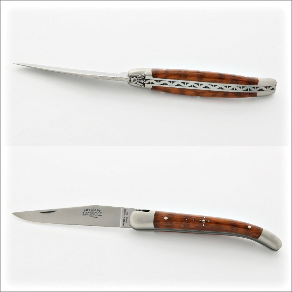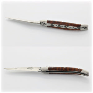 There are many reasons a Laguiole knife can retail for much more than another model of similar size and material. The finish of the metal, the construction of the spring and bee, and the chiseling and filing of the spring & bee all contribute to the added cost. Most mass-market Laguiole knives have a soldered bee and rarely a hand-chiseled spring top and bee. This collector's knife also features the iconic Shepherd's cross and a blade-stop to prevent the blade from making contact with the bottom of the spring.