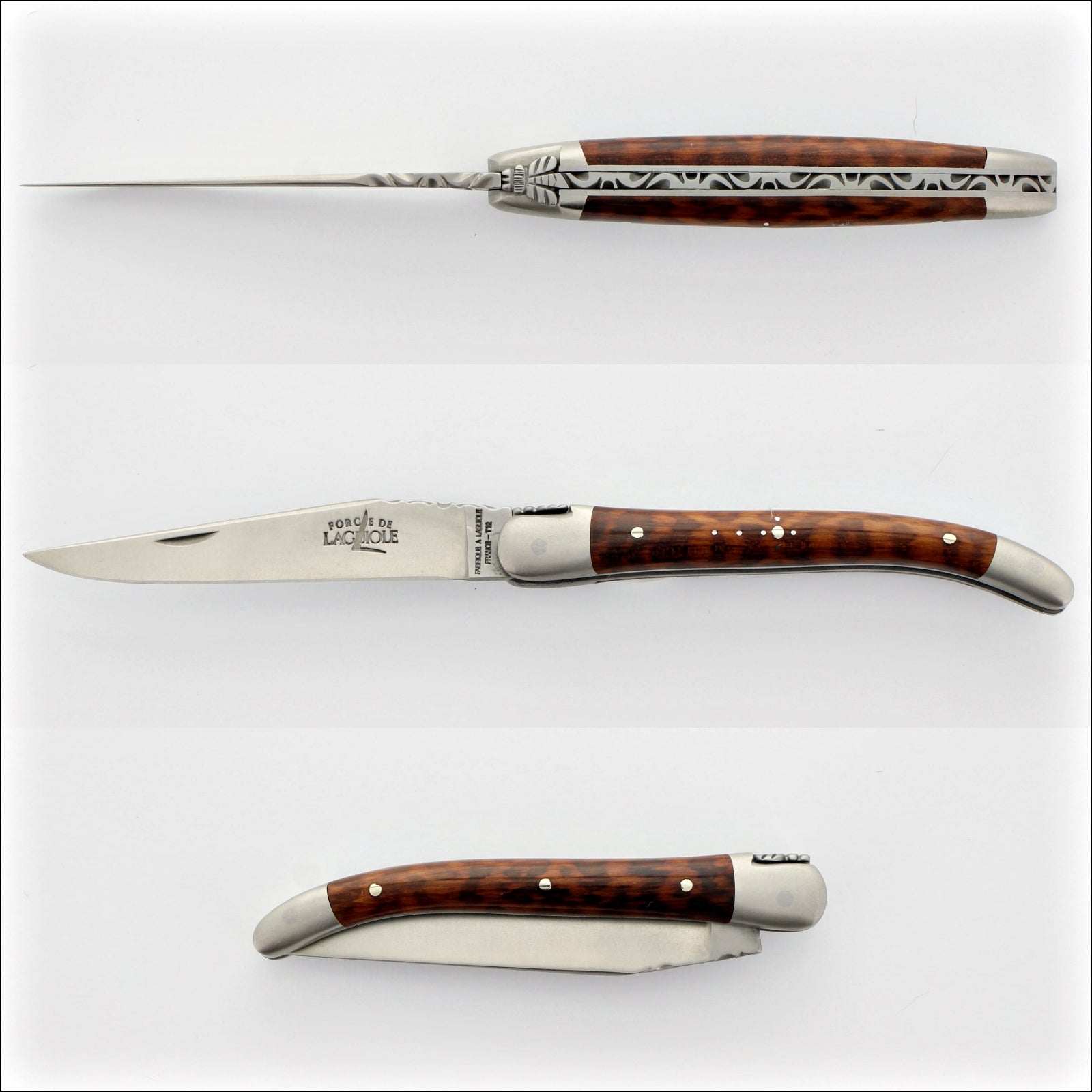 The file work on the springs (top of handle) are individually hand filled by a French artisan, therefore all are different. Additionally, two handles made from the same material can have very different patterns.