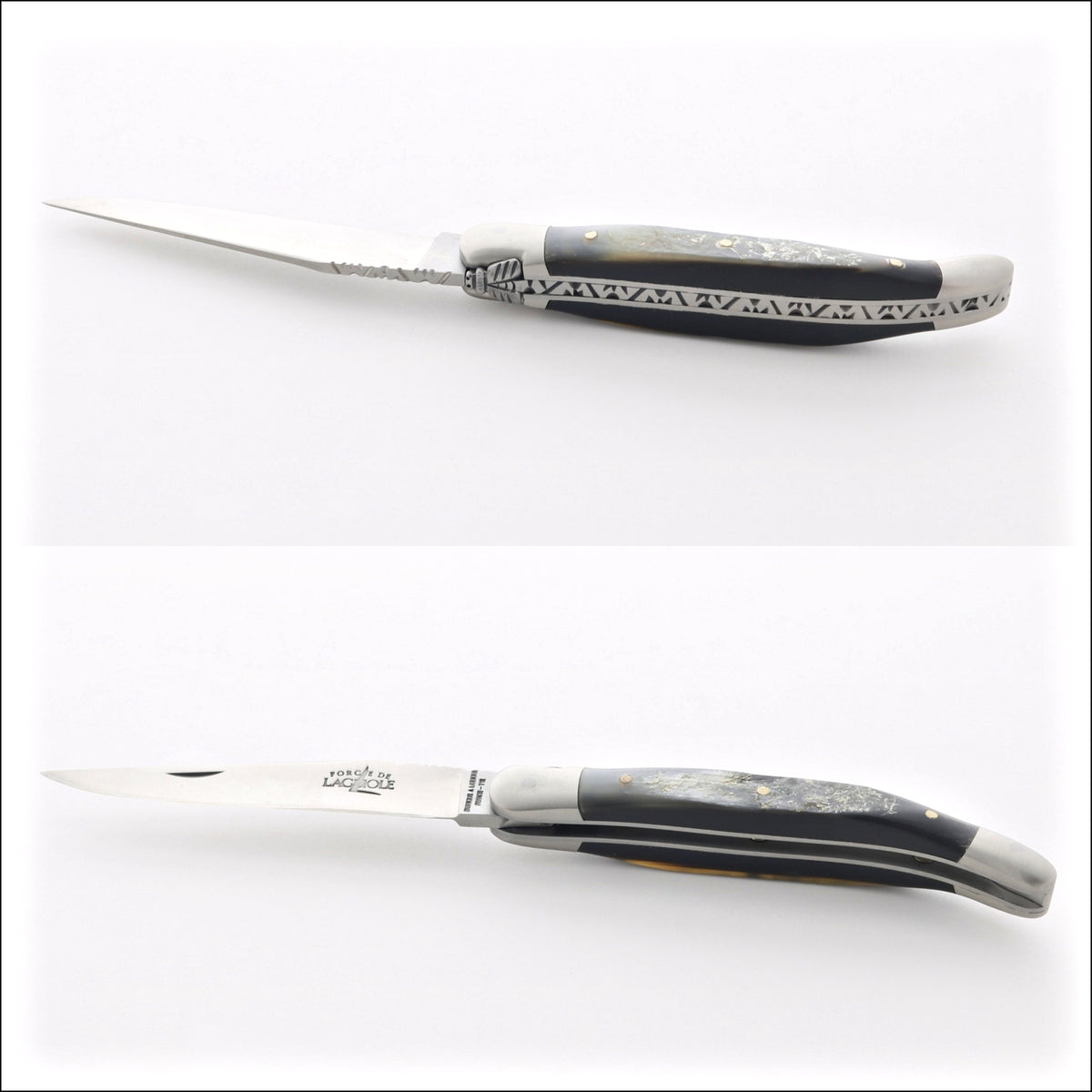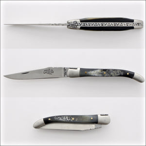 There are many reasons a Laguiole knife can retail for much more than another model of similar size and material. The finish of the metal, the construction of the spring and bee, and the chiseling and filing of the spring & bee all contribute to the added cost. Most mass-market Laguiole knives have a soldered bee and rarely a hand-chiseled spring top and bee. This collector's knife also features the iconic Shepherd's cross and a blade-stop to prevent the blade from making contact with the bottom of the spring.