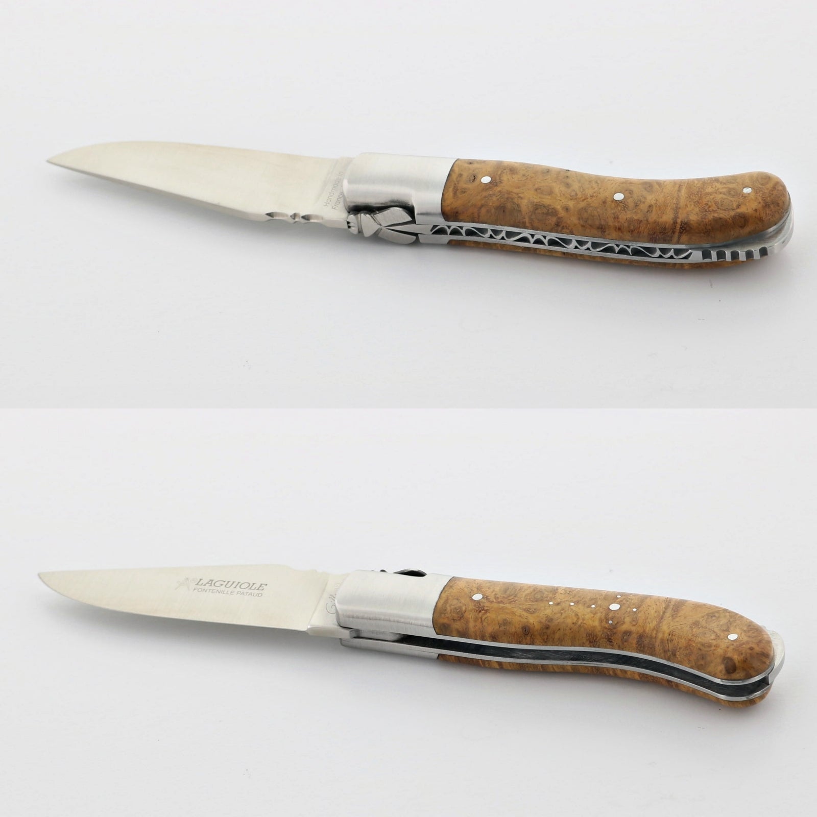 The file work on the springs (top of handle) are individually hand filled by a French artisan, therefore all are different. Additionally, two handles made from the same material can have very different patterns.