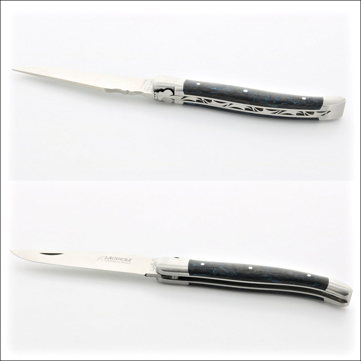 The file work on the springs (top of handle) are individually hand filled by a French artisan, therefore all are different. Additionally, two handles made from the same material can have very different patterns.