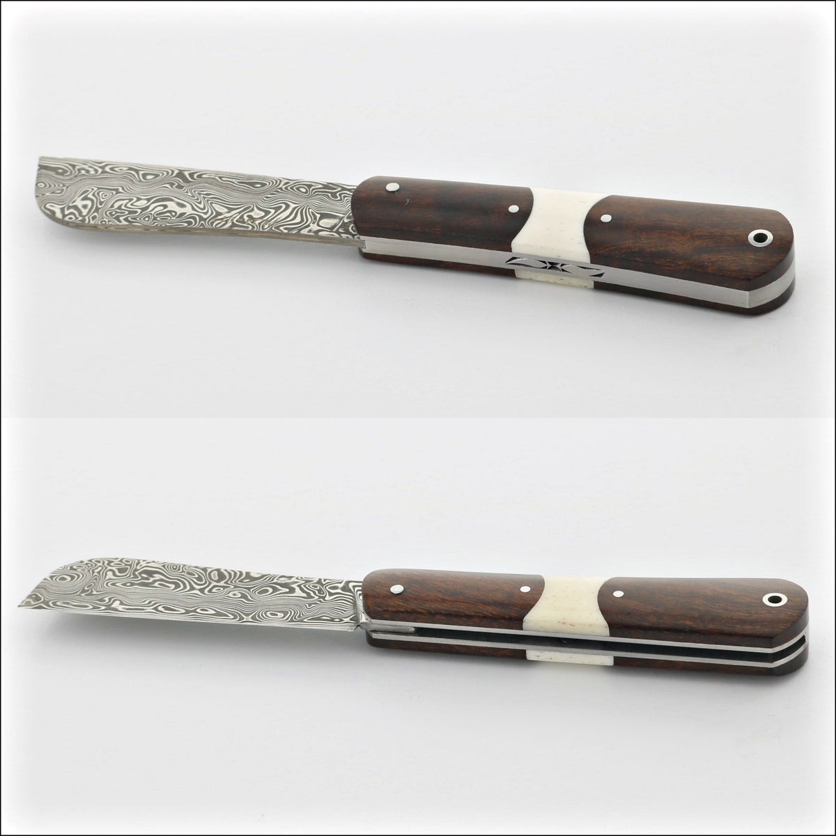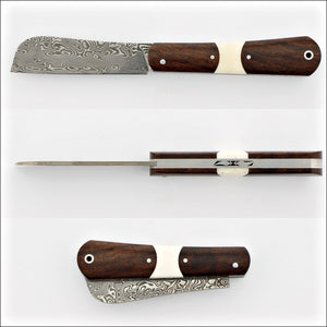The knife boasts a meticulously hand-chiseled spring and a sturdy blade stop, alongside a practical lanyard hole, retaining the essence of the original design. The innovative addition of a "Center bolster" elevates the aesthetic, available in a variety of materials including bone, stainless steel, and luxuriant Damascus.