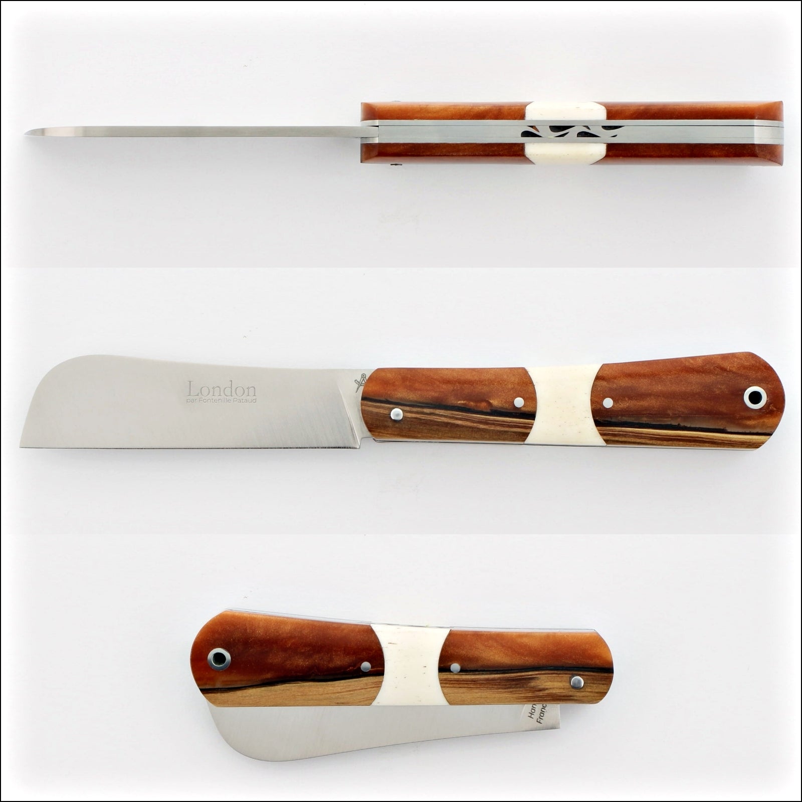 The Fontenille Pataud London Folding Knife is an exquisite piece of French craftsmanship from Thiers, renowned for its centuries-old cutlery tradition. This modern iteration pays homage to the classic "London Sailor's Knife" from the 19th century, reimagined for contemporary use with portability in mind — effortlessly fitting into a pocket or purse.