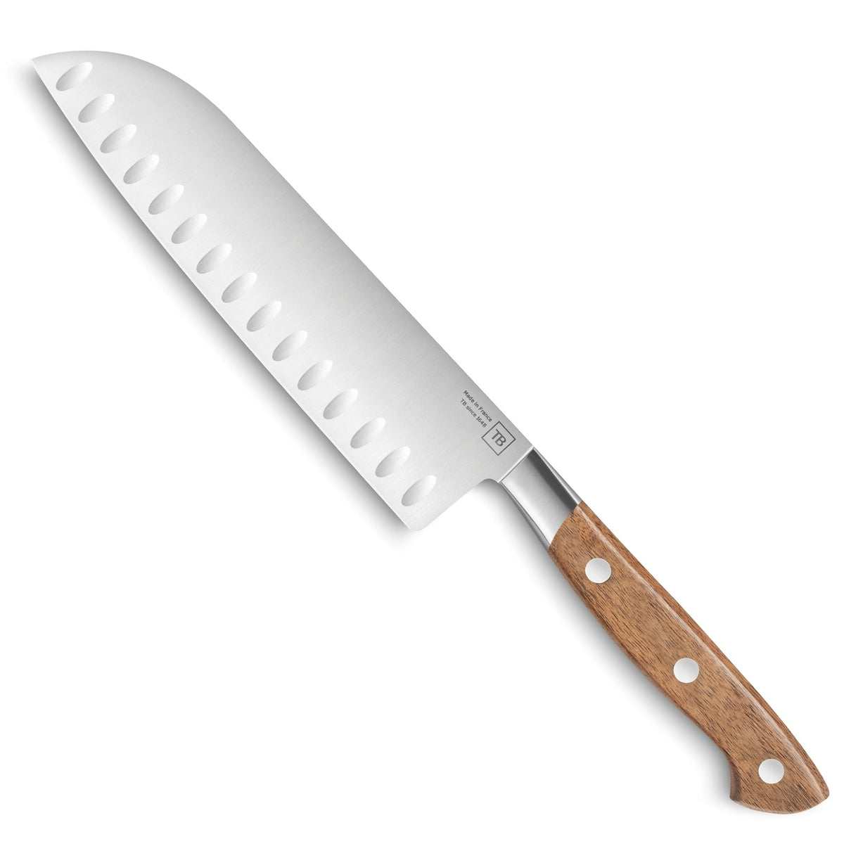 Discover the George Santoku knife, meticulously crafted in Thiers by renowned French cutler Tarrerias-Bonjean, mostly known as "TB." This knife features a 16.5 cm (7.5") X46Cr13 High Carbon Stainless Steel