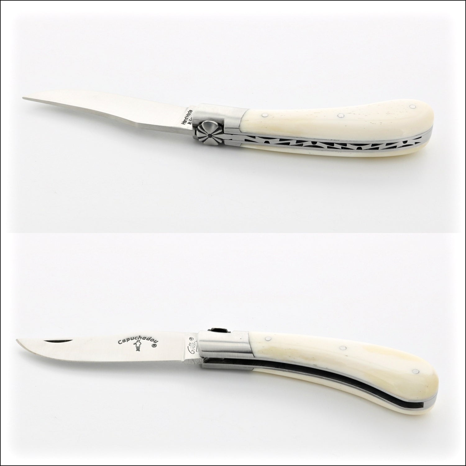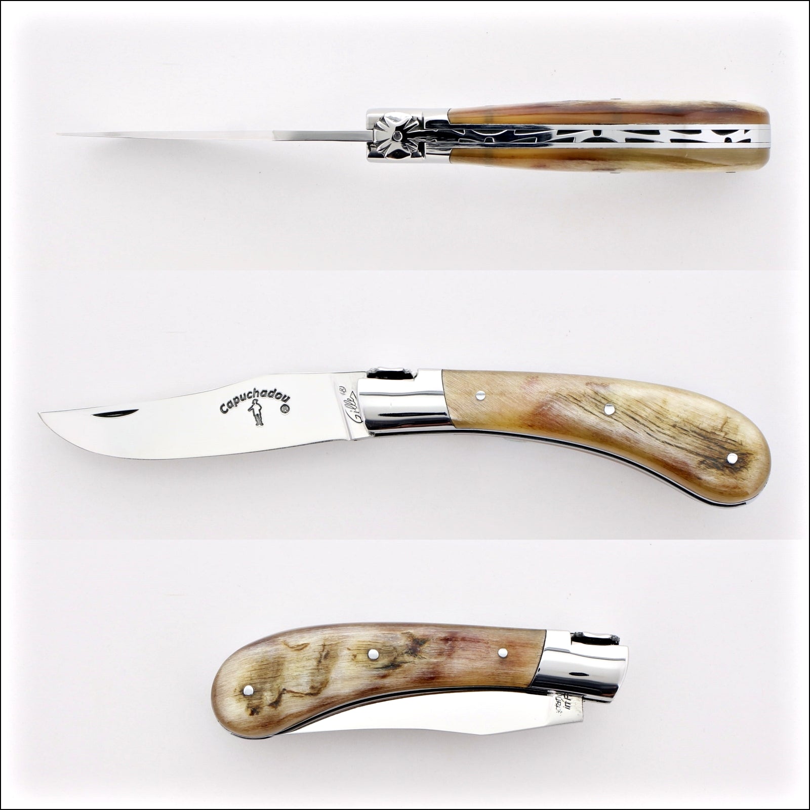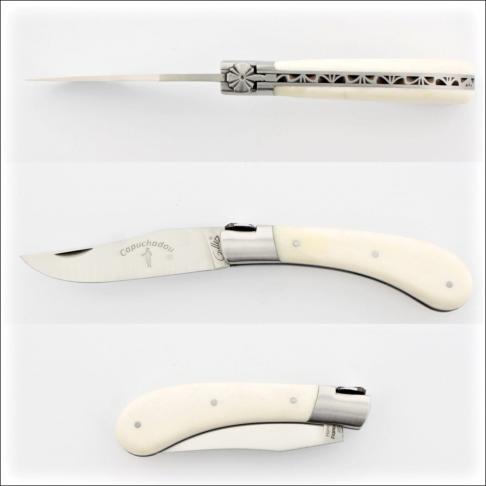 Before the development of the Laguiole knife in the 19th century, French shepherds used a knife called the "Capuchadou" (or "capujadou"). This versatile knife served many daily purposes, from preparing lunch to tending to their flock of sheep. Fontenille Pataud stands out as one of the premier manufacturers of French pocket knives. Each Capuchadou is 100% made in France and features a smooth mechanism along with a solid blade stop that protects the blade's edge when the knife is closed.