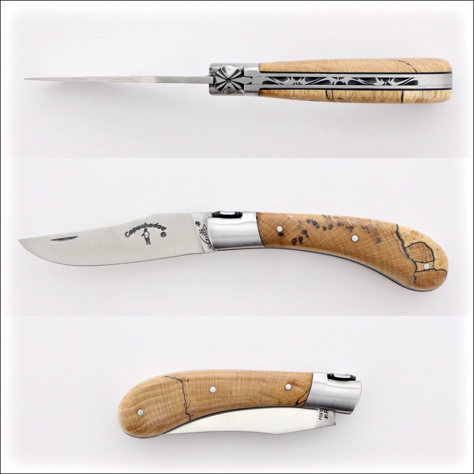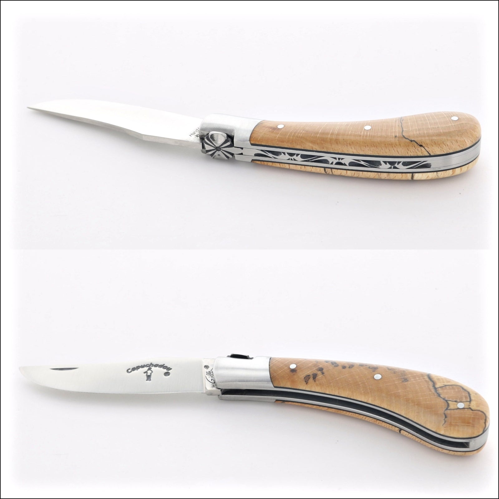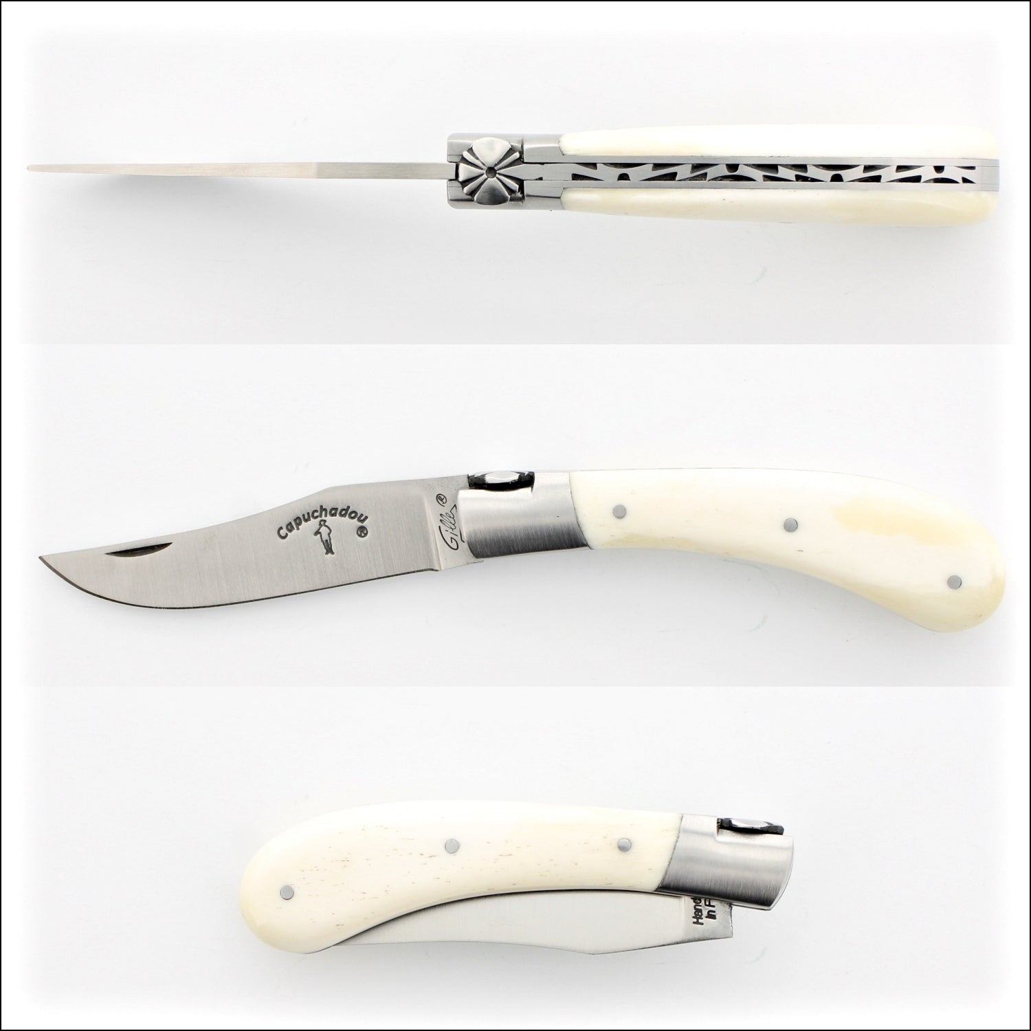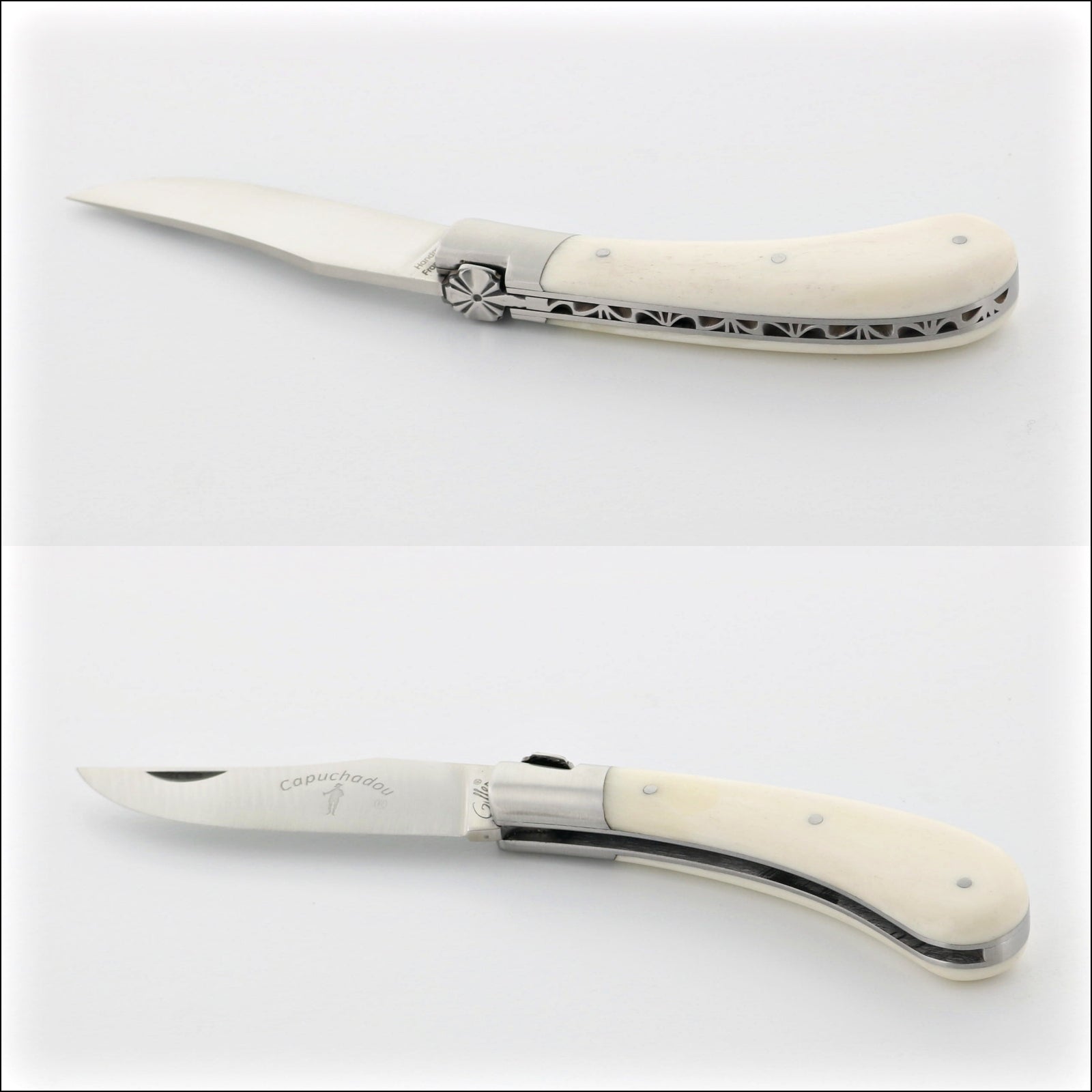 Before the development of the Laguiole knife in the 19th century, French shepherds used a knife called the "Capuchadou" (or "capujadou"). This versatile knife served many daily purposes, from preparing lunch to tending to their flock of sheep. Fontenille Pataud stands out as one of the premier manufacturers of French pocket knives. Each Capuchadou is 100% made in France and features a smooth mechanism along with a solid blade stop that protects the blade's edge when the knife is closed.
