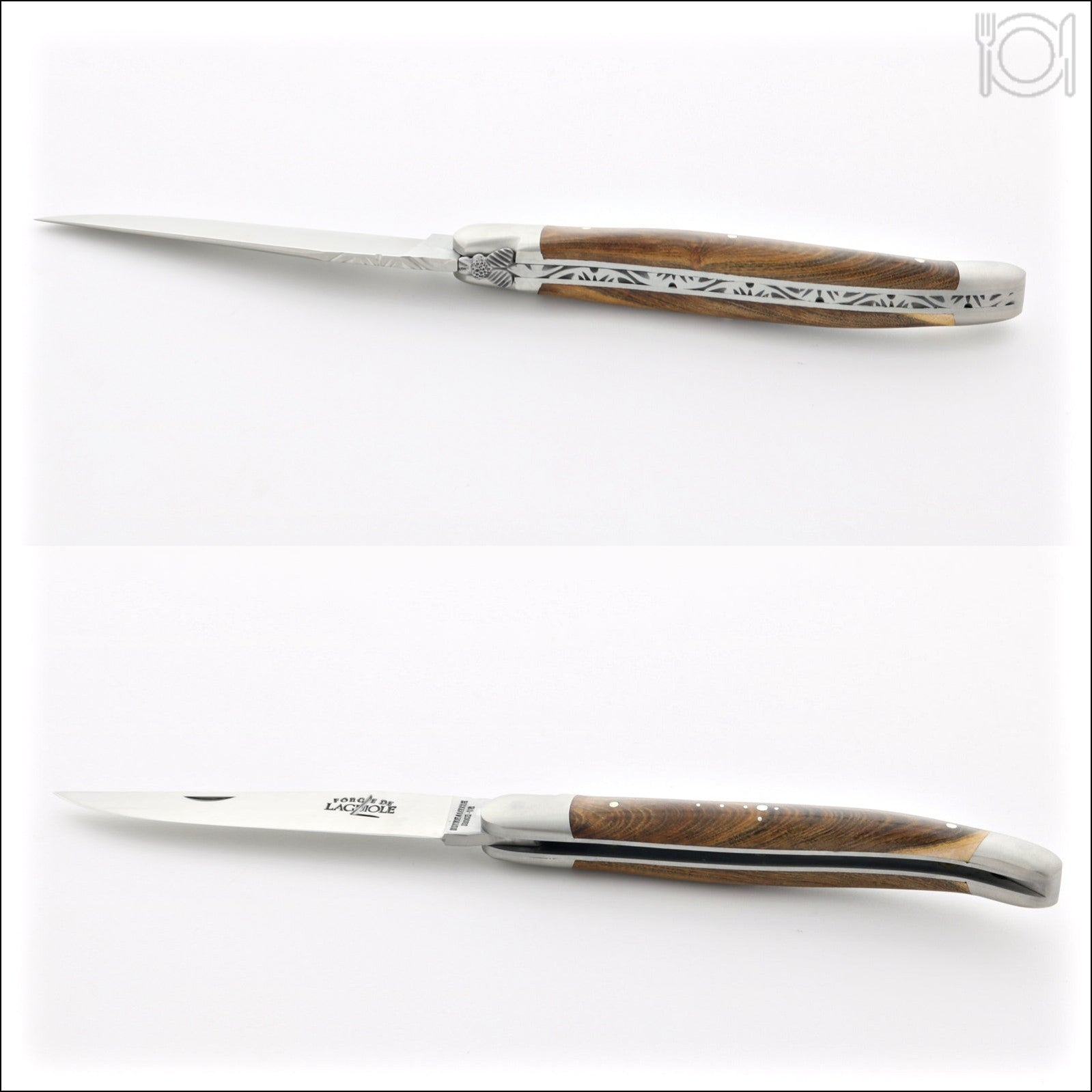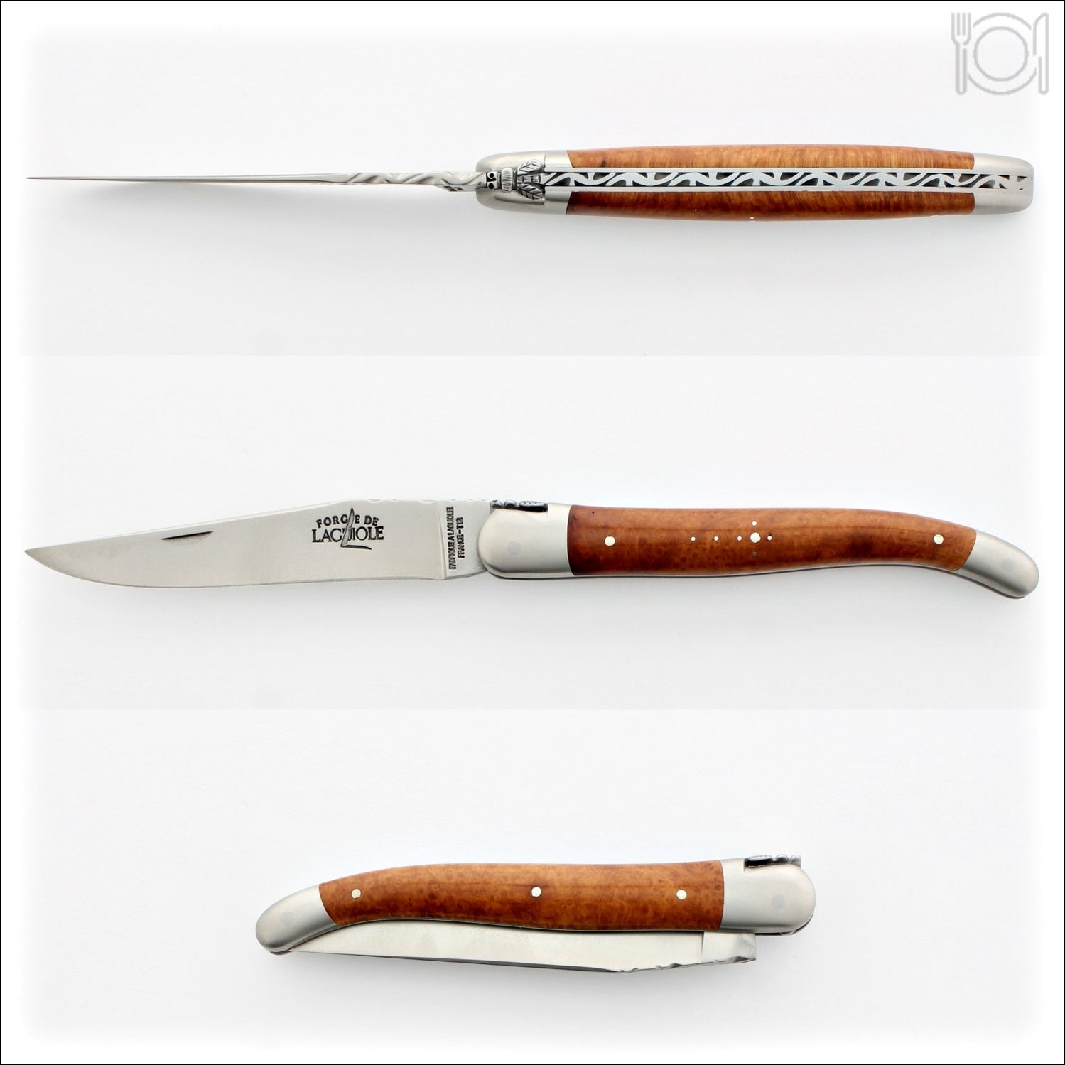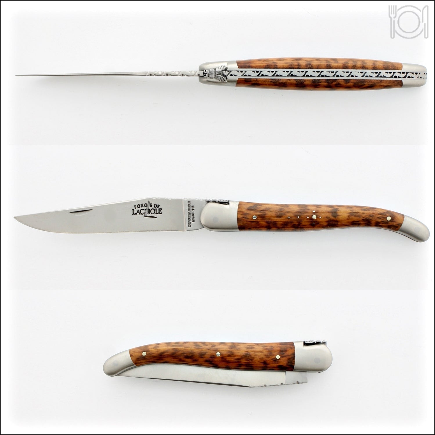 Forge de Laguiole knives are a French symbol of quality, craftsmanship, and design. The higher cost of certain models, like the "Forged Collection", can be explained by the sheer amount of time spent to create intricate chiseling on the bee and unique filling on the springs. Every knife in this collection is unique and individually photographed.