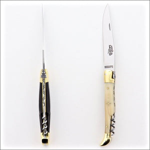A 12 cm Laguiole folding knife can be used as a steak knife; its open length is 8. 3/4" vs. ~9" for a standard steak knife. Why use such a knife at the dinner table or at your favorite steak house? Check out our article (new tab) for the surprising answer.